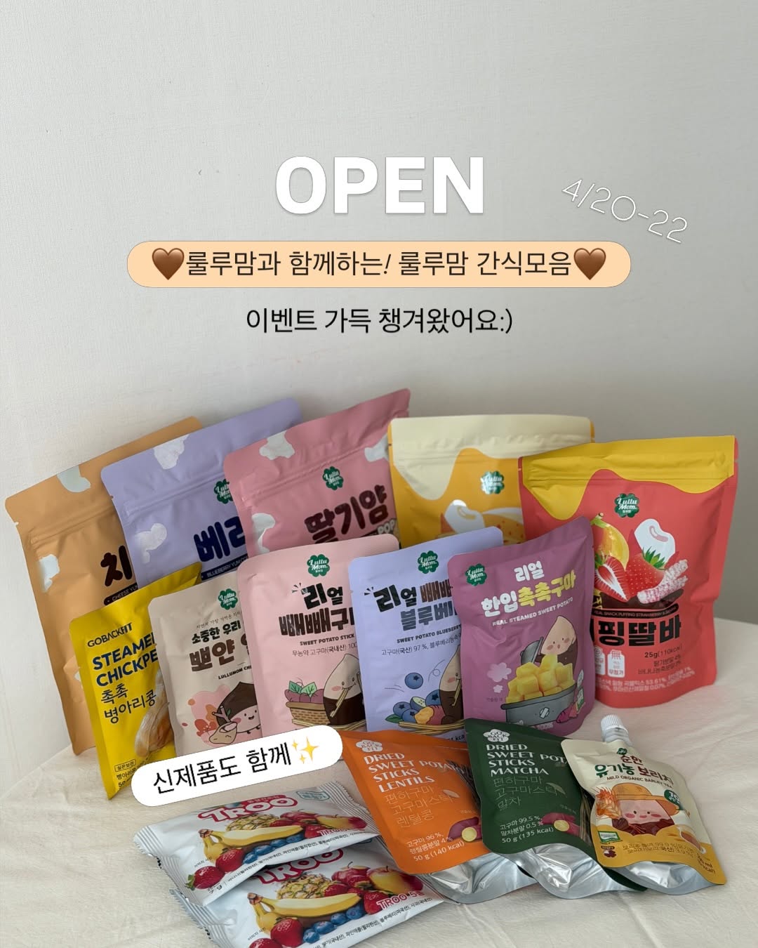 인기만점 룰루맘 원물간식이 돌아왔어요🎉 아이들이 잘먹는 아기간식 할인가로 만나보세요💛 댓글로 [링크] 남겨주시면 DM으로 최저가 구매링크 보내드릴게요✨ ✔️구매는 10시부터 가능하시고, 제품 별 상세내역&세트 구성 및 가격은 미리 보실 수 있으십니닷🫶🏻 🎁 구매인증 이벤트 🎁 ❣️ 선착순 50분께 퍼핑딸바 1봉씩 추가로 보내드릴게요 ❣️ ‘구매완료+휴대폰 뒷4자리’ 댓글 달아주시면 추첨을 통해 5분께 [네이버페이 3,000원] 보내드릴게요 ❣️ 4만원 이상 구매 시 신제품 ‘보리차 3봉’ 함께 보내드려요 ﹋﹋﹋﹋﹋﹋﹋﹋﹋﹋﹋﹋﹋﹋﹋﹋ 🖤 룰루맘 간식모음 ✅ 런칭 2년만에 누적판매량 200만개인 빼빼구마! ✅ 후기 좋고, 엄마들이 찾는 아기간식:) ✅ 무농약 100% 국산 고구마 ✅ 고온고압 멸균 스팀 방식 제조 ✅ 첨가물 없는 원물간식 ✅ 이번에 출시된 신상 소개! → 여러맛 골라담은 동결건조과일칩 → 아빠엄마 건강간식 편하구마 → 런칭기념 가격, 성분 모두 착한 유기농보리차 🖤 공구품목 ✔️ 리얼빼빼구마(오리지널,블루베리) ✔️ 뽀얀알밤 ✔️ 촉촉구마 ✔️ 촉촉 병아리콩 ✔️ 퍼핑스낵 2종 (퍼핑딸바, 퍼핑치즈) ✔️ 콘스낵 얌 3종 (딸기얌,베리얌,치즈얌) ✔️ 동결건조칩 ‼️동결건조칩 포함 주문시 23일(목)부터 순차출고됩니다‼️ ✔️ 편하구마 렌틸콩/말차 ✔️ 유기농보리차 ﹋﹋﹋﹋﹋﹋﹋﹋﹋﹋﹋﹋﹋﹋﹋﹋ 첫째 아기때부터 내돈내산하던 간식 원물 그대로 아기한테 줄 수 있어 안심되고 무엇보다 아이가 참 잘먹고 좋아해요💛 이미 수많은 후기가 말해주고, 빼빼구마는 출시 2년째 누적판매량이 무려 200만개!!✨ 첫 공구 오픈때도 인기만점이었는데 처음 보여드림에도 다들 좋아해주시고 후기에도 별 다섯개⭐️⭐️⭐️⭐️⭐️ 재구매율 높은 빼빼구마는 얇고 길어서 아이가 혼자 잡고 먹기 쉽고, 그래서 외출간식으로도 완전 딱이에요 보통 외출간식은 엄마도 아이도 편한거 찾는데 원물+스스로+맛있게 잘먹어서 빼빼구마 찾는 분들 정말 많으시더라고요😊 게다가 아기부터 7살 형님까지 모두의 입맛을 사로잡은 원물간식이라니! 아이들 수시로 간식거리 먹을거리 찾는데 쟁여두면 진짜 든든해요>.<👍🏻 (엄마아빠가 먹어도 맛있어요) 🍠 돌전부터 추천하는 부드러운 촉촉구마 첨가물 없는 국산밤으로 만든 🌰 뽀얀알밤도 정말 달달하고 인기만점 💛 저희아이 요즘 최애 병아리콩은 하나씩 집어먹기 좋고 단백질 챙겨주기 정말 좋아요! 🔥 빼빼구마의 인기를 따라잡고있는 신상 퍼핑스낵과 콘스낵도 꼭 함께 데려가세요 룰루맘 간식은 룰루맘에게 구매하신다는 귀여우신>.< 분들이 계셔서 사비이벤트를 안 할 수가 없잖아요오🫶🏻 이번에도 선착순 50분께! 퍼핑딸바 함께 보내드릴게요 요즘 뜨고있는 스낵간식 드셔보세요💝 ﹋﹋﹋﹋﹋﹋﹋﹋﹋﹋﹋﹋﹋﹋﹋﹋ 📍 기간 : 4월 20일(월) ~ 22일(수) 자정까지! 📍 배송 : 배송비 3,000원 / 평일 오후 1시 이전 결제시 당일 출고 - 주문 수량이 많을 경우 하나 이상의 박스로 나뉘어 다른날 도착할 수 있습니다! ﹋﹋﹋﹋﹋﹋﹋﹋﹋﹋﹋﹋﹋﹋﹋﹋ 🏷️ 사전예고이벤트 당첨(디엠보내드릴게요!) @mi_kkangs @gahee_90 @__oct_28 @cookimoon23 @yuro_trillion 궁금하신 점 있으시면 언제든 댓글이나 디엠 보내주세요 감사합니다💓