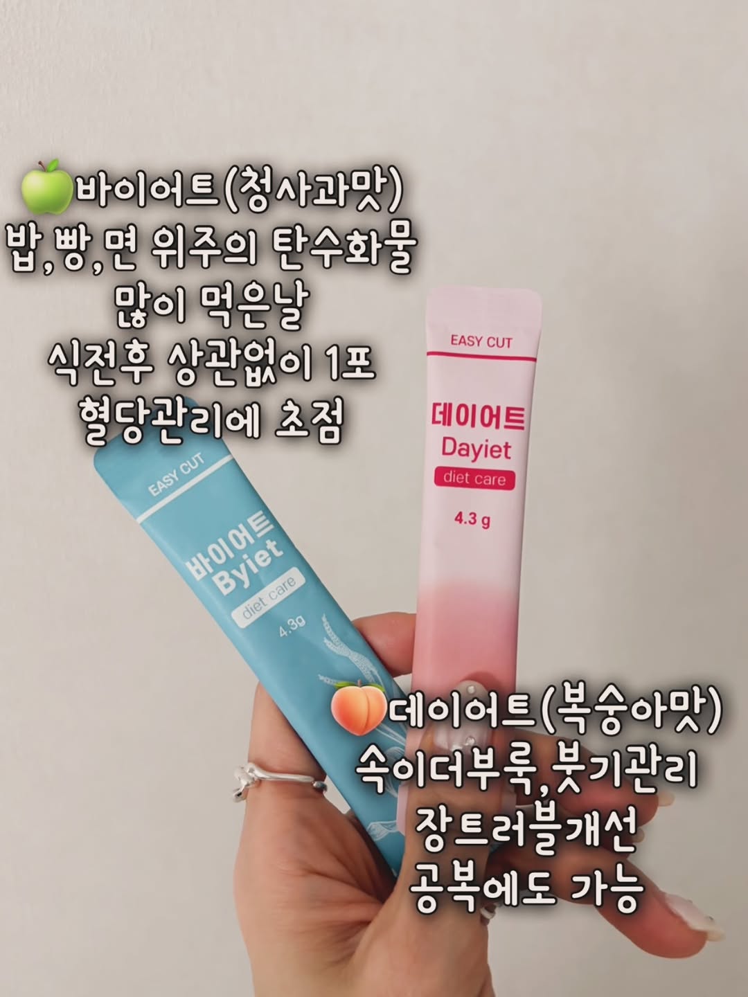 바이어트VS데이어트🍑🍏 어떻게 다를까? 다이어트의 기본인 ✔️체지방,혈당,장건강은 기본값이고 부원료만 변화를 줘서 과식한날은 바이어트, 나트륨섭취가 많은날 붓기가 걱정되는날, 공복에도 먹을수있는 데이어트 이렇게 나누셔서 최대 하루 4포까지 조합해서 드시면됩니다. 슬라이드 넘겨보시면 상황별 추천조합을 올려드렸으니까 참고해주시고 새로나온 데이어트조합으로 관리해보세요. 🍏바이어트 (청사과맛) 밥·빵·면 위주로 탄수화물 많이 먹은 날 ”오늘 많이 먹었네“ 싶은날! 식사전후 상관없이 1포! 🍑데이어트 (복숭아맛) 나트륨섭취를 많이한 다음날 몸이 무겁고 부한느낌이 드는날 공복에 한포! (자기전도 OK) 붓기관리에도 적합 바이어트 + 데이어트 런칭이벤트 마지막날이에요. 지금 프로필클릭👆