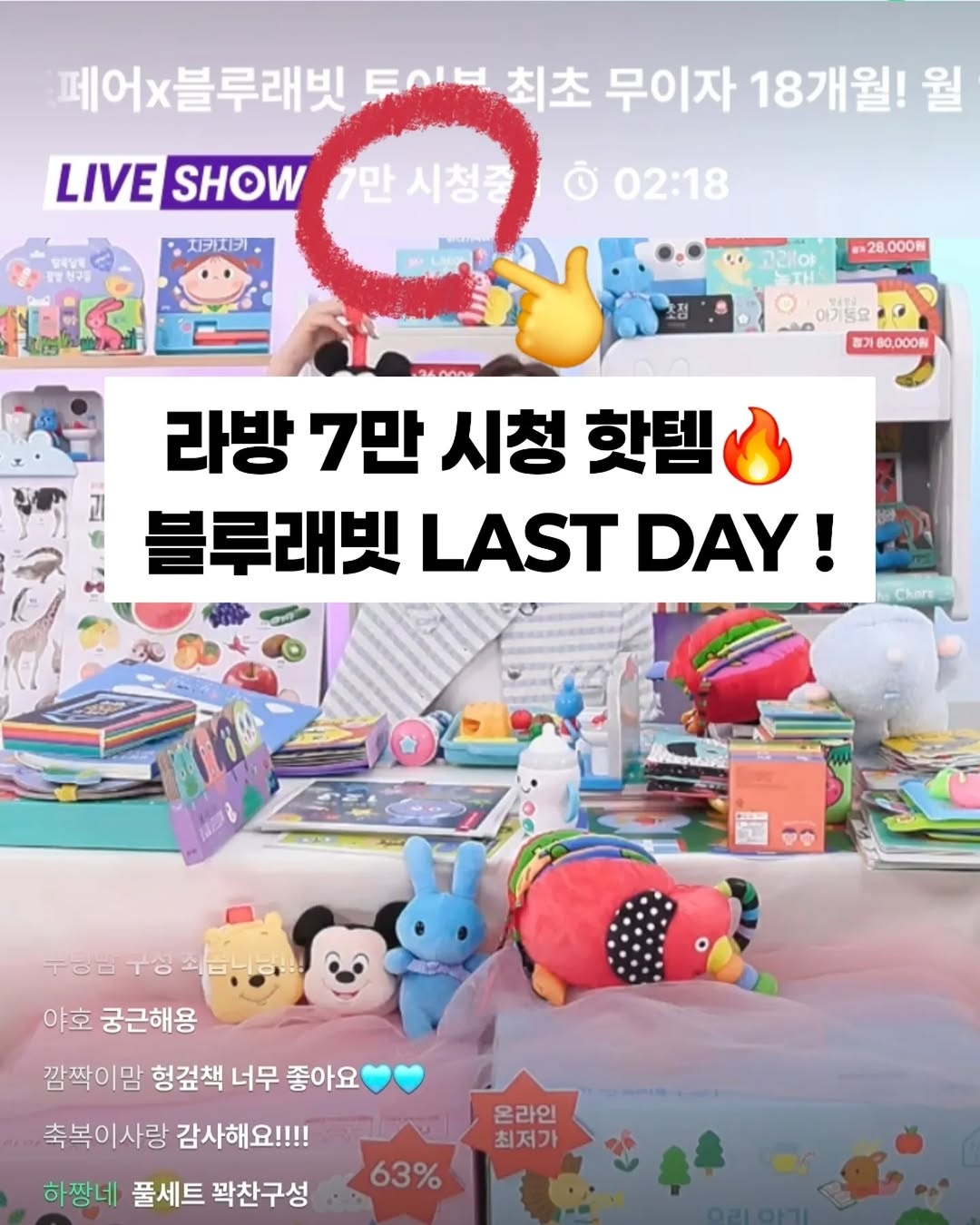 라방 7만분 시청의 핫한🔥 블루래빗 '첫토이북' 역대급 가격과 혜택‼️ 오늘 마감입니다..🫶 이 다음 공구는 없거나, 아주 먼 미래일 것 같아요.. 이 세트 하나면 신생아~5세 육아 준비 끝!! 고민되시는 분들, 이 가격에 91종이면 진짜 왕푸짐!! 후회없으실겁니다.... 고고고고고고!!!👆👆 참, 링크는 제 프로필링크에 걸어두었어요👀 #블루래빗 #첫토이북