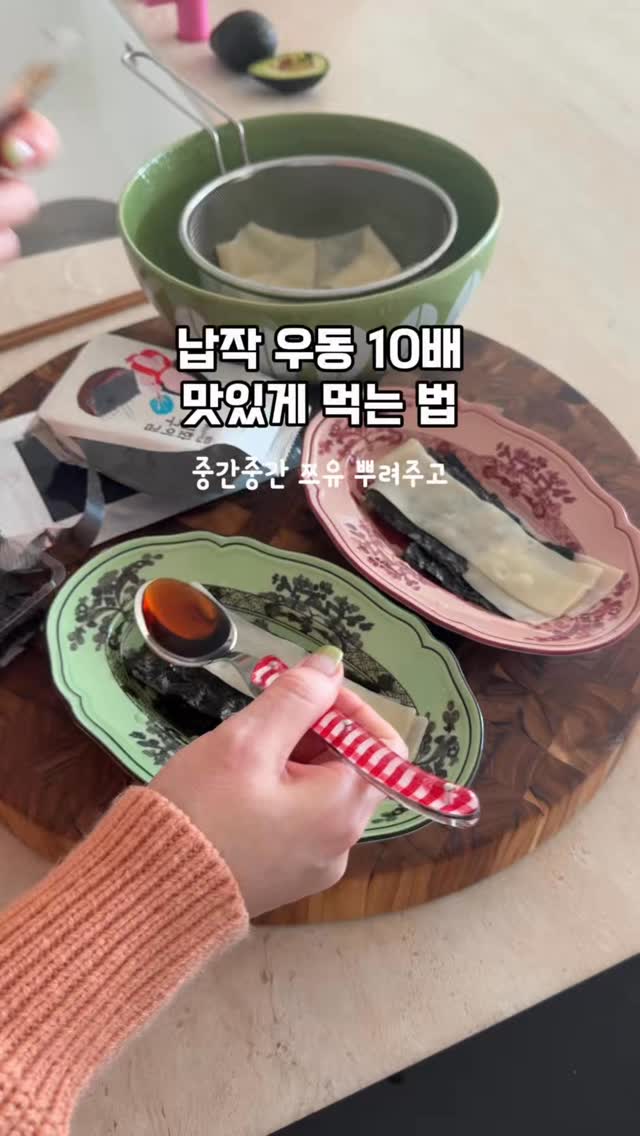 너무 맛있어서 눈커지는👀 초간단 주말 메뉴 꼭 드셔보세요. 맛보장^^ 오니히모가와우동, 납작우동 준비하고 납작우동은 한 줄씩 끓는물에 넣어 딱 10분만 삶아 냉수에 헹궈 건져요. 우동 면은 쿠*, 컬*에서 주문 쉽게 가능하고 대형마트에도 있어요. 접시에 우동한줄, 꽃님이 김 한장, 얇게썬 대파를 켜켜이 겹치게, 와사비김도 같이 겹쳐올려요. 동봉된 쯔유를 중간중간 뿌려주고 마지막에 다 부어주세요. 별거아닌데 진짜 띠용! 너무 맛있어요. 냉모밀같은 느낌인데 쫀득한 우동에 대파향, 와사비 킥! 딸이랑 둘이 정신없이 흡입했어요. 영상 속 김은 꽃님이네🌸 김이 풀어지지않는게 참 신기하고 기름 쩐내가 없어서 우동이랑 한줄한줄 떠먹는데 와 기가막혀요. 와사비김 이건진짜 왔을 때 드셔보아야합니다! 여름에 냉모밀 드실때 부셔넣으면 끝장나는 맛 완성이거든요! 맥주 안주 말모! 김 받으시면 꼭 맛나게 드셔보세요. 일요일 내일까지만 꽃님이 김 공구창 열어둘게요! 이쁜 봄 되이소💚💚🌸 #꽃님이네김 #납작우동 #오니히모가와우동 #집밥메뉴