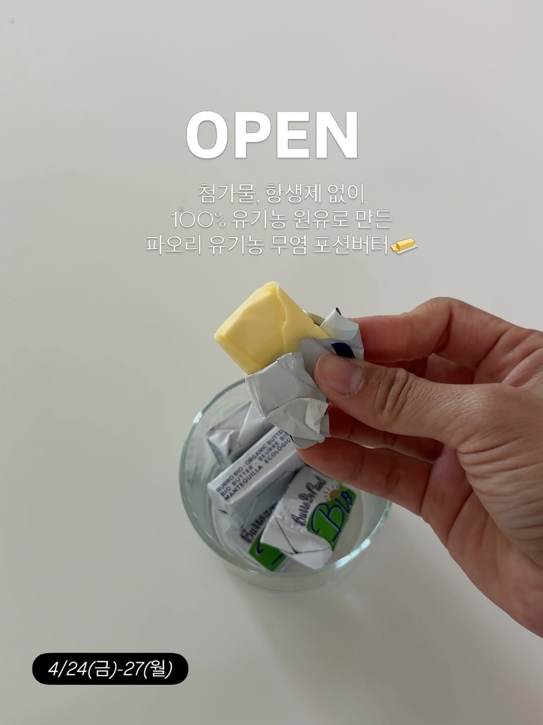 국내 유일 100% 유기농 포션버터 𝙊𝙋𝙀𝙉 🖤 밥태기 치트키로도 쓰이는 버터! 착한가격으로 데려왔어요🧈 댓글로 [링크] 남겨주시면 DM으로 최저가 구매링크 보내드릴게요✨ 🎁 구매인증 이벤트 🎁 ‘구매완료+휴대폰 뒷4자리’ 댓글 달아주시면 3분 추첨해서 [네이버포인트 3,000원] 보내드릴게요🫰🏻 ﹋﹋﹋﹋﹋﹋﹋﹋﹋﹋﹋﹋﹋﹋﹋﹋ 🖤 파오리 유기농 포션 무염버터 ✅ 1박스, 12.5g x 10개 ✅ 국내 유일 유기농 포션 무염버터 ✅ 파오리는 70년 역사의 이태리 최고의 버터 장인 가문 브랜드예요 ✅ 유로리프와 ICEA 인증을 받은 정식 유기가공식품 ✅ 음식할 때, 간식만들 때, 빵에 발라먹어도 맛있어요! 🖤 공구품목 ✔️ 파오리 유기농 포션버터 (무염) 10개입 4세트 ✔️ 파오리 유기농 포션버터 (무염) 10개입 8세트 ﹋﹋﹋﹋﹋﹋﹋﹋﹋﹋﹋﹋﹋﹋﹋﹋ 제가 평소 좋아하던 버터가 가격이 너무 올라 고민이었는데 가격도 좋고, 성분도 좋아서 딱 고른 버터 소개해드릴게요✨ 저는 간식 만들때도 버터 자주 사용하고 유아식 할 때 볶음밥, 카레 등 풍미 살리고 밥맛 살리고 싶을 때 버터 종종 사용하거든요! 한 덩어리로 되어있는거는 소분하기 너무 귀찮고 꺼내쓰기도 불편한데 이건 한개씩 개별포장되어 있는 포션버터라 냉동실에 얼려두고 편하게 꺼내써요 매번 대량으로 쓰는게 아니다보니 확실히 개별 포장되어있는 포션버터가 남김없이 깔끔하게 잘 쓰게 되더라고요👏🏻 성분 꼭 따지는 편이라 아무거나 고를 수 없었는데 이건 첨가물 없고 유기농 인증 받은 100% 유기농 버터로 이미 컬x에서도 후기 5000개 이상! 품절도 자주 되는 제품이에요🤩 유기농 우유로 만든 신선한버터 파오리 유기농 포션버터 알림남겨주세요 저는 버터는 고민없이 무염으로 고르는데 파오리도 당연히 무염제품입니다💛 ﹋﹋﹋﹋﹋﹋﹋﹋﹋﹋﹋﹋﹋﹋﹋﹋ 📍 기간 : 4월 24일(금) ~ 27일(월) 📍 배송 : 월요일 출고! ﹋﹋﹋﹋﹋﹋﹋﹋﹋﹋﹋﹋﹋﹋﹋﹋ 사전예고 이벤트 당첨❤️ @ban__jiwon05 @luvda_17 @yoni__.c @ye.seul.___ @yexn_i @limeunhee1022 @young_dew10 @clsrn6153 @coemiae349 @seong_sini 궁금하신 점 있으시면 언제든 댓글이나 디엠 보내주세요 감사합니다💓