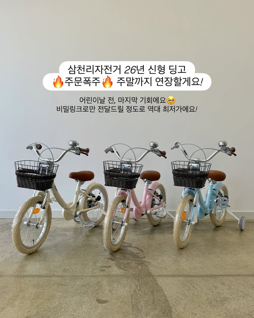 삼천리 26년 신형 딩고&하츄핑 자전거의 공동구매가 연장되었습니다. 어린이날 선물로 적합한 디자인과 가격으로, 비밀링크를 통해 주문 가능합니다.