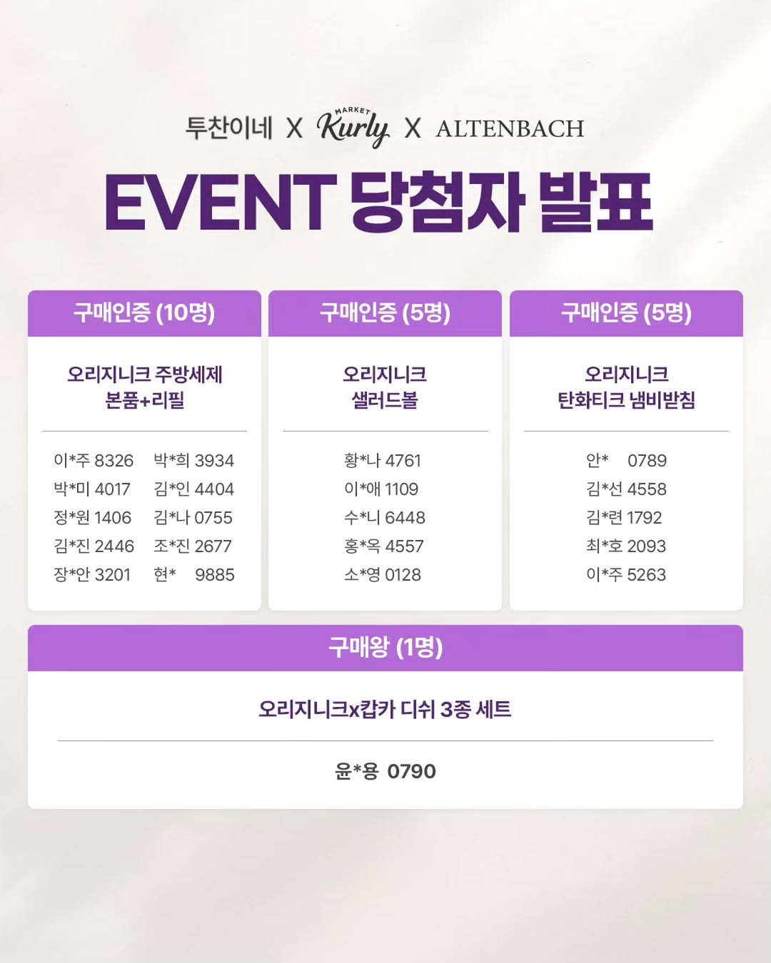 #이벤트발표 #까사무띠공구 . 지난 달에 있었던 컬리×투찬이네 알텐바흐 공동구매 이벤트 당첨자 발표할게요♡ 당첨 되신 분들 축하드려요!! . 그리고 이번달 일정표에는 없었지만 까사무띠 부케 공구가 마감 되고 재공구 요청이 들어와서 문의를 드리면서 5월부터 가격이 인상된다고 하셔서 급하게 일정을 잡았어요 투찬이네에서는 4월 22일 ~ 4월 26일까지 진행 될 예정이고 이번에는 2인세트 구성도 만나보실 수 있으실것 같아요:) 4인 세트 구매시 아모르 피오레 테이블 매트 4P (색상랜덤) 도 받으실 수 있으니 참고하세요~ 참!! 추가 8% 할인혜택도 놓치지 마세용❤️ . 문의사항은 카카오톡에서 투찬이네 채널 검색하셔서 톡주세요 투찬이네 채널을 추가하시면 다양한 공구소식을 오픈일에 알림톡으로 알려드려요♡