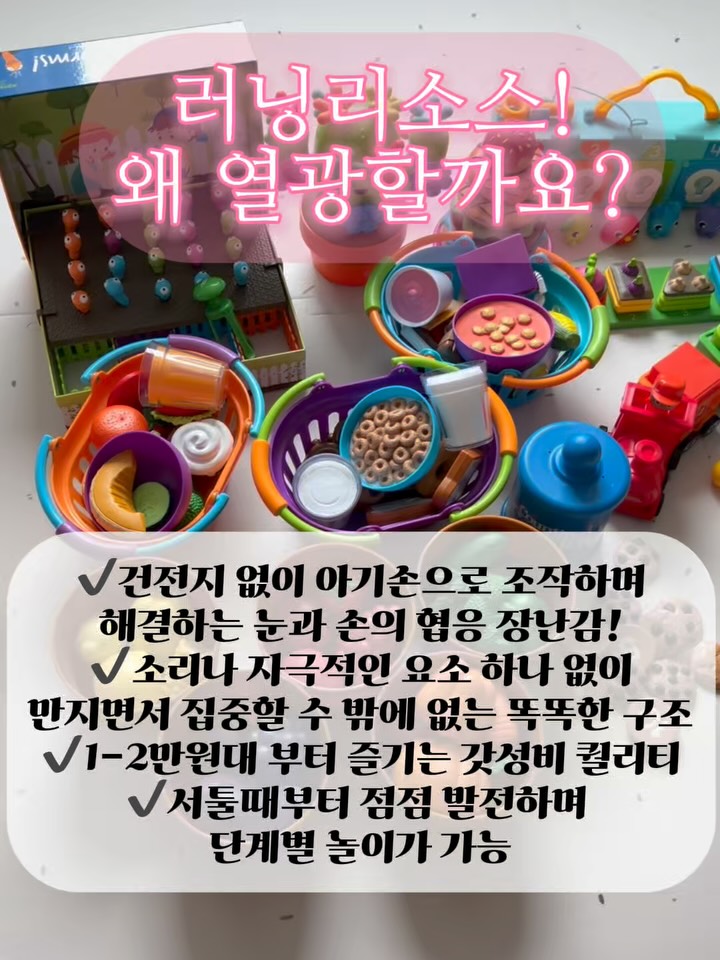네.. 이건 꼭 들이셔서 자연스러운 두뇌자극과 발달이 함께 이루어지는 이득을 맛보셔요..👏🏻👏🏻 그리고 무엇보다 아기가 너무너무 애정해서 오~~~ 래 가지고 놀고 뽕뽑기 좋아요🙌🏻♥️ 장난감이 주는 이로운 발달들에 비해 가격도 너무 좋고, 장난감 퀄리티도 좋아서 진짜 싹 다 득템하셔도 후회 없을거라고 자신있게 약속 드려 봅니다🥹 6개월부터 야금야금 들여온 러닝리소스! 드디어 보여드리네요~ 희유는 도너츠쌓기를 시작으로 처음엔 모두 서툴지만 하나하나씩 레벨업 성장해가며 지금은 조금 더 잘하는 요무진 꼬맹이가 되었어요♥️ 러닝리소스의 장점은 장난감 하나하나가 단순히 그냥 빼고 넣고의 개념뿐만 아닌 자연스러운 숫자, 컬러 노출과 수세기, 언어발달, 인지력등이 마구마구 상승할 수 있도록 엄청 똑똑하게 잘만든 장난감이라 이걸 잘하게 됬다면 또 다른부분을 공부해 나가는 입구는 있으나 출구는 없는 그런장난감 이랍니다🥰 ▶️러닝리소스란? 미국의 유치원과 초등학교에서 사용 하는 교구로 이미 국내뿐아니라 해외 여러 교육 선진국에서 학습교구로 인정 받아 다양하게 사용되고 대부분 과일 야채세트 몬테소리센터나 발달센터에서도 많이 사용하고 있고 다양한 놀이를 즐기며 학습까지 가능한 제품입니다👏🏻👏🏻 놀면서 배우는 교구 ‼️ 미국 교육전문가들이 개발한 유아 초등 교육용 교구 브랜드로, 놀이를 통해 수학, 감각 발달을 자연스럽게 배우도록 설계되어 똑똑한 교구 장난감🫶🏻 건전지 하나도 필요 없이! 불빛, 사운드 자극 없이! 엄마아빠와 교감하며 배우고 아이 발달단계에 맞춰 다양하게 선택해요!🥰 ▶️이번에 처음 보여드리는 라인업은 인기제품 모아모아 - 과일야채 색깔구분세트 - 아침,점심, 저녁 세트 - 도너츠 쌓기 - 플라워 선인장 페그 - 꿈틀 지렁이 정원세트 new - 소근육 운동 집게 세트 new - (똑똑한쿠키) 수세기 쿠키 new - 수세기 5색 블록기차 new - 무지개 정원 쌓기 놀이 new - 자물쇠놀이 클럽 하우스 new 🔥이번 라인업 최고예요..👏🏻👏🏻인기품목 싹끌어옴♥️ ‼️1만원대 부터 득템하는 교구들인데, 가격대비 퀄리티가 진짜 좋고 발달에 도움되는게 눈으로도 보이니 만족도가 너무 높습니다~!!강추드리고 싶어요🙌🏻 🔥인기 품목은 품절이 발생할 수 있으니 오픈런 하셔서 득템하시기 바랄께용🔥