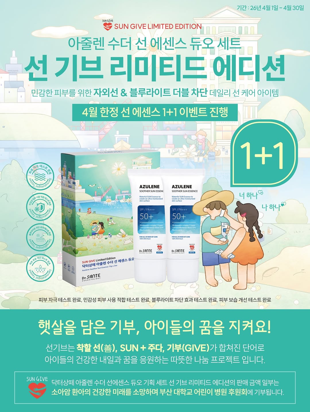 상떼 수더 선에센스 1+1 이벤트가 4월 1일에 오픈됩니다. 이 행사는 소아암 환우들을 위해 기부됩니다.