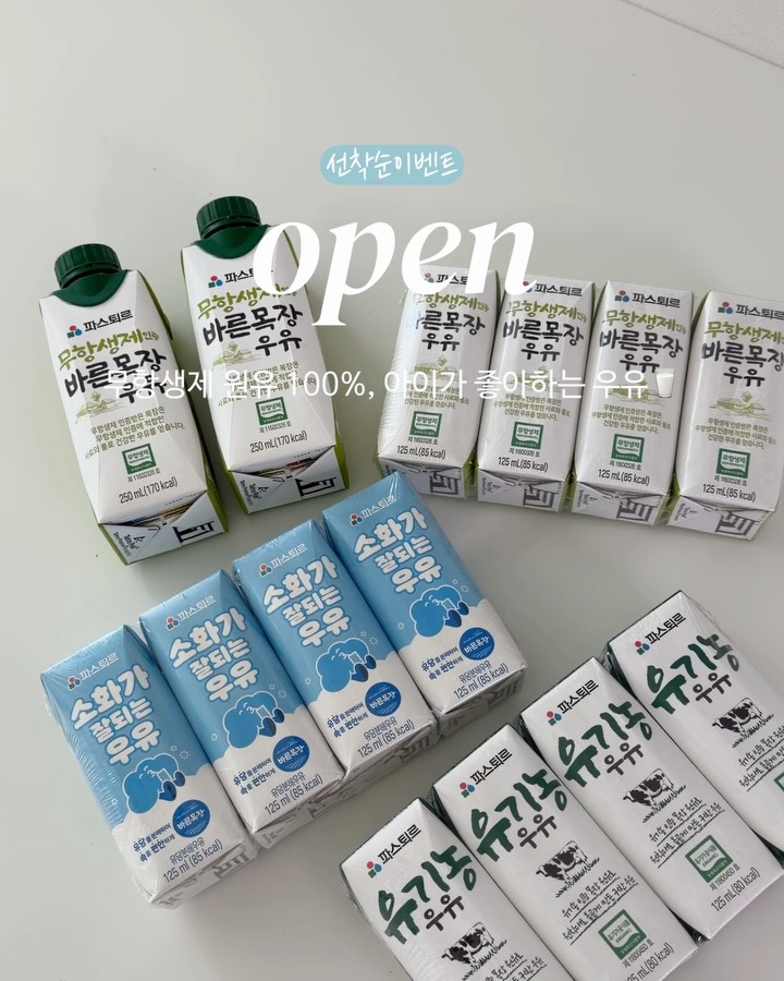 #오픈 #선착순이벤트 두달만에 돌아온 파스퇴르🥛 기다려주시는 분들 많아서 감사한 마음에 이번에는 사비이벤트까지 추가해서 가져왔어요! 맛있는 우유 함께 먹어요🤍 댓글로 [링크] 남겨주시면 DM으로 최저가 구매링크 보내드릴게요✨ 🎁 구매인증 이벤트 🎁 1️⃣ 구매 선착순 10분께 [파스퇴르 유산균 음료 1박스]씩 보내드릴게요🫰🏻 2️⃣ ‘구매완료+휴대폰 뒷4자리’ 댓글 달아주시면 10분 추첨해서 [네이버포인트 2,000원] 보내드릴게요🫰🏻 ﹋﹋﹋﹋﹋﹋﹋﹋﹋﹋﹋﹋﹋﹋﹋﹋ 🖤 파스퇴르 우유 3종 🤍 무항생제 우유 125ml/250ml ✅ 파스퇴르 대표 시그니처 멸균우유 ✅ 파스퇴르 전용목장 무항생제 원유 100% ✅ 빛과 공기를 차단해주는 6개 층의 특수멸균 패키지 ✅ 125ml/250ml 두가지 용량 선택가능 🤍 유기농 우유 125ml ✅ 국내 유일, 파스퇴르 전용 유기농 목장에서 생산되는 프리미엄 우유 ✅ 국립농산물품질관리원 10가지 엄격한 유기농 인증 기준 모두 통과 ✅ 무항생제 우유보다 한층 더 깊고 진한 고소함과 은은한 달콤한 맛 ✅ 빛과 공기를 완벽하게 차단하는 6개 층의 특수 멸균 패키지 🤍 소화가 잘되는 우유(락토프리) 125ml ✅ 유당불내증, 우유 맛 싫어하는 아이들에게 추천! ✅ 유당제거 과정에서 단맛이 증가해 달콤하고 맛있어요 ✅ 국내 유일! 소용량 락토프리 우유 ✅ 유당불내증이 있는 가족 구성원도 함께마셔요 ✅ 빛과 공기를 완벽하게 차단하는 6개 층의 특수 멸균 패키지 🖤 공구품목 (→ 2박스 구매시 추가할인 적용✨) ✔️ 파스퇴르 무항생제 우유 125ml 24개입 ✔️ 파스퇴르 무항생제 우유 250ml 20개입 ✔️ 파스퇴르 유기농 우유 125ml 24개입 ✔️ 파스퇴르 소화가 잘되는 우유(락토프리) 125ml 24개입 📅 파스퇴르 멸균우유 소기비한 (26. 02. 02 기준) 1. 무항생제 우유 125ml: 26.6.25 이후 2. 무항생제 우유 250ml: 26.8.8 이후 3. 유기농 우유 125ml: 26.7.18 이후 4. 소화가 잘되는 우유 125ml. 26.3.23 이후 ﹋﹋﹋﹋﹋﹋﹋﹋﹋﹋﹋﹋﹋﹋﹋﹋ 아기 우유 고를때마다 고민되신다면 무엇보다 아이가 잘먹고, 무항생제 원유 100%로 만들어 믿고 먹일 수 있는 파스퇴르 우유 추천드려요🤍 ✨ 무항생제 인증목장 원유 100% ✨ 파스퇴르 전용 목장 원유 100% ✨ 편리하고 간편한 무균포장 패키지 보여드리는 우유 모두 무항생제 인증목장에서 만들었고, 특징에 따라 조금씩 차이가 나요! ✅ 파스퇴르 대표 시그니처 멸균우유인 [무항생제 바른목장 우유] ✅ 첫 우유로 많이 선택되는 [유기농 우유] ✅ 유당불내증 있는 아이들을 위한 유당제거 우유인 [소화가 잘되는 우유] 파스퇴르는 아이들 잘먹는 후기가 가득하고, 엄선된 원료로 올곧게 만든 프리미엄 우유니 믿고 드셔보세요🥛 우유는 아기가 잘 먹는게 제일 중요하잖아요 아기가 좋아하는 우유로도 유명한 파스퇴르😍 후기만 보셔도 느껴지실거예요! 저희아이도 진짜 잘 먹습니다>.< 저희 아이가 너어무 잘 먹어서 2개월 주기로 가져오는 공구였는데 이제는 다들 다음 일정을 기다려주시고 디엠으로 오픈 언제인지 꾸준히 문의주시는,,ㅎㅎ 돌 지난 아이 하루 우유 소비량이 4~500ml 정도라 비용도 만만치 않잖아요 하루 2-3팩 먹어도 한달이면 두박스는 기본이라 공구로 여러박스 사두는게 훨씬 이득인 것 같아요! 한박스만 사도 전지역 무.료.배.송🚚 첫날 주문해서 드셔보시고 마감전까지 추가구매 하셔도 무료배송이니 부담없어요 파스퇴르 공구는 두달에 한번씩 찾아올 예정이니, 저와 함께 파스퇴르로 정착해보아요🤍 ﹋﹋﹋﹋﹋﹋﹋﹋﹋﹋﹋﹋﹋﹋﹋﹋ 📍 기간 : 2월 3일(화) ~ 6일(금) 자정까지, 4일간! 📍 배송 : 전지역 무료배송! ﹋﹋﹋﹋﹋﹋﹋﹋﹋﹋﹋﹋﹋﹋﹋﹋ 🏷️ 사전예고이벤트 당첨(디엠보내드릴게요!) @shinhj0507 @jyeon2_yu @muu_lucky 궁금하신 점 있으시면 언제든 댓글이나 디엠 보내주세요 감사합니다💓 #파스퇴르 #아기우유 #우유추천