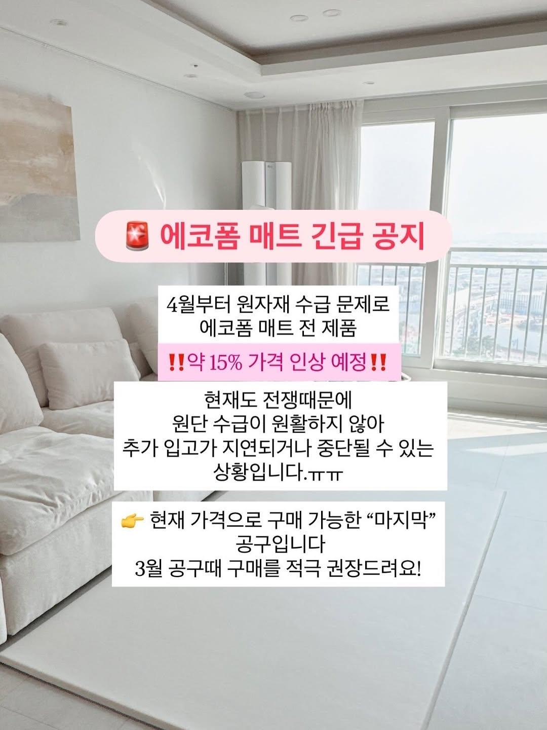 오픈 @remy_mom__ 와 함께합니다🫶🏼 ‼️4월 가격 인상 예정‼️ 🚨 에코폼 매트 공지사항 4월부터 원자재 수급 문제로 에코폼 매트 전 제품 약 15% 가격 인상이 예정되어 있습니다. 현재도 전쟁으로 원단 수급이 원활하지 않아 추가 입고가 지연되거나 중단될 수 있는 상황입니다. 👉 현재 가격으로 구매 가능한 마지막 공구. ☑️배송안내 🚚 1-2주이내 출고 주문양이 많은경우 3주이내 소요될 수 있습니다. 가벼우니까 매트 들어서 진짜 청소하기 쉽고 이리저리 옮기기도 쉽고 거실엔 두개깔면 사이즈가 딱 좋더라구요! 매트 하나 있으면 놀이할 때 소리도 안나고 푹신하니까 매트에 앉아서 놀거든요! 뒷면엔 미끄럼 방지 처리까지^^ 매트로 유명한 에코폼 브랜드라 믿고 쓸 수 있어요. 3차 재공구인만큼 구매자 분들 후기도 정말 좋답니다! 저처럼 13mm정도 너무 두껍지도, 너무 얇지도 않은 매트 원하셨다면 이번 신상🌟에코폼 플랫매트🌟 추천드립니다 1.3cm 다용도 두께로 new리빙매트와 같은 두께에요 !! 너무 얇지도 두껍지도 않지만 쿠션감도 있고 아이방 바닥 보호용으로 카페트 깔기 애매한 자투리 공간에도 휘뚜루마뚜루 어디든 잘 어울리는 매트 ! 먼지날림 NO, 세탁 번거로움 NO 매일 사용하는 공간에 깔아도 부담 없도록 물티슈/돌돌이로 간편하게 쓱쓱 청소 끝! 논슬립 처리된 바닥면으로 밀림 걱정도 없어요^^! 🎁event🎁 10만원이상 구매시 층간소음 방지 스티커 증정 @remy_mom__ 링크로 구매가능하세요🫶🏼 #에코폼 #에코폼매트 #매트 #매트추천 #시공매트