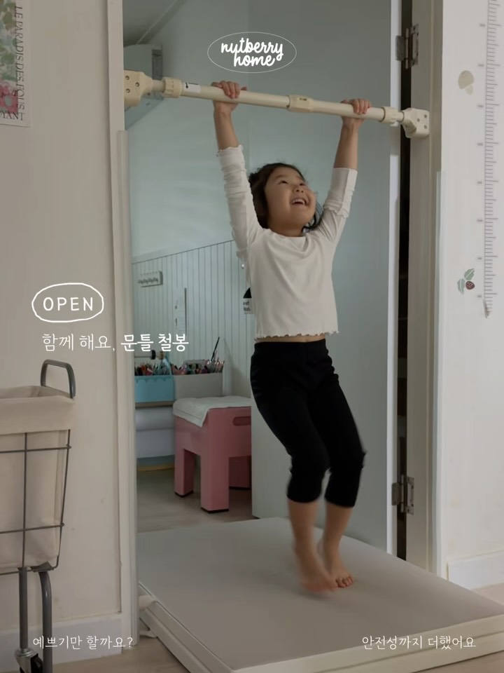 아이들이 하루종일 매달려 놀 수 있는 감성 문틀 철봉입니다. 전신 건강에 도움이 되며, 안전 인증과 고강도 스틸로 제작되어 믿고 사용할 수 있습니다.