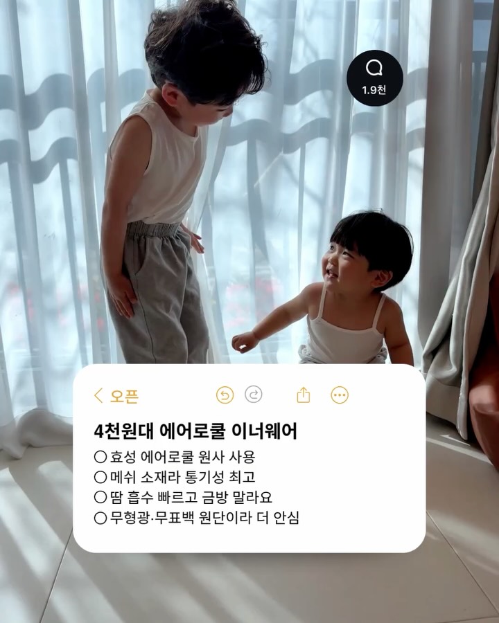 [공구오픈] 3~4천원대 에어로쿨 / 촤르르 이너웨어 💌 구매를 원하시면 댓글에 ‘링크’ 남겨주세요 구매하실 수 있는 링크 DM으로 바로 보내드릴게요! 알림댓글 1900개 돌파!❤️🔥 날 풀렸다고 그냥 얇은 옷만 입혔다가 아이 옷 벗겨보면 등에 땀 차있는 거… 엄마들은 다 아시죠🥹 저희 시어머님도 애들 보시면 제일 먼저 속옷부터 확인하시는데 진짜 옛말 틀린 거 하나도 없더라고요. 특히 아이들은 조금만 뛰어도 등에 땀이 금방 차고 그 상태로 바람 불면 괜히 감기 걱정되고, 옷도 몸에 달라붙어서 더 찡찡해지잖아요. 그래서 저는 요즘 속에 이거 하나 꼭 입혀요💛 에어로쿨 메쉬 이너웨어! ✔ 효성 에어로쿨 원사 사용 ✔ 메쉬 소재라 통기성 최고 ✔ 땀 흡수 빠르고 금방 말라요 ✔ 사방스판이라 활동하기도 편하고 ✔ 무형광·무표백 원단이라 더 안심 ✔ 100% 국내생산 무엇보다 원단이 진짜 부들부들해서 투하도 불편하다고 안 하고 한번 입혀보니 이것만 찾더라고요🤍 개당 4천원대… 땀 많고 더위 많이 타는 아이들, 어린이집·유치원 다녀오면 늘 등에 땀 차있는 아이들, 요건 꼭 한번 입혀보세요! ✔ 옵션 (에어매쉬) * 끈나시 3장 1세트 * 나시 3장 1세트 * 속바지 3장 1세트 ✔ 옵션 (촤르르나시&속바지) * 나시 3개1세트 * 나시 4개1세트 * 속바지 3개1세트 * 속바지 4개1세트 ✔ 사이즈 (에어매쉬) 5호 : 3-4세 7호 : 4-5세 9호 : 5-6세 11호 : 6-7세 13호 : 8-9세 15호 : 9-10세 17호 : 10-11세 ✔ 사이즈 (촤르르나시&속바지) 100 : 3-4세 / 13-17 kg 110 : 4-5세 / 17-21 kg 120 : 5-6세 / 21-25 kg 130 : 7-8세 / 25-30 kg 140 : 9-10세 / 30-35 kg 150 : 11-12세 / 35-40 kg 160 : 13-14세 / 40-50 kg 📍 투하스펙 태하(6세) > 착용사이즈 11호 / 120 도하(25개월) > 착용사이즈 - 5호 / 100 ㅡㅡㅡㅡㅡㅡㅡㅡㅡㅡㅡㅡㅡㅡㅡㅡㅡㅡㅡㅡㅡㅡ 📢 공구 기간 | 4월 23일(목) ~ 4월 27일(월) 📌 프로필 링크에서 구매 가능!