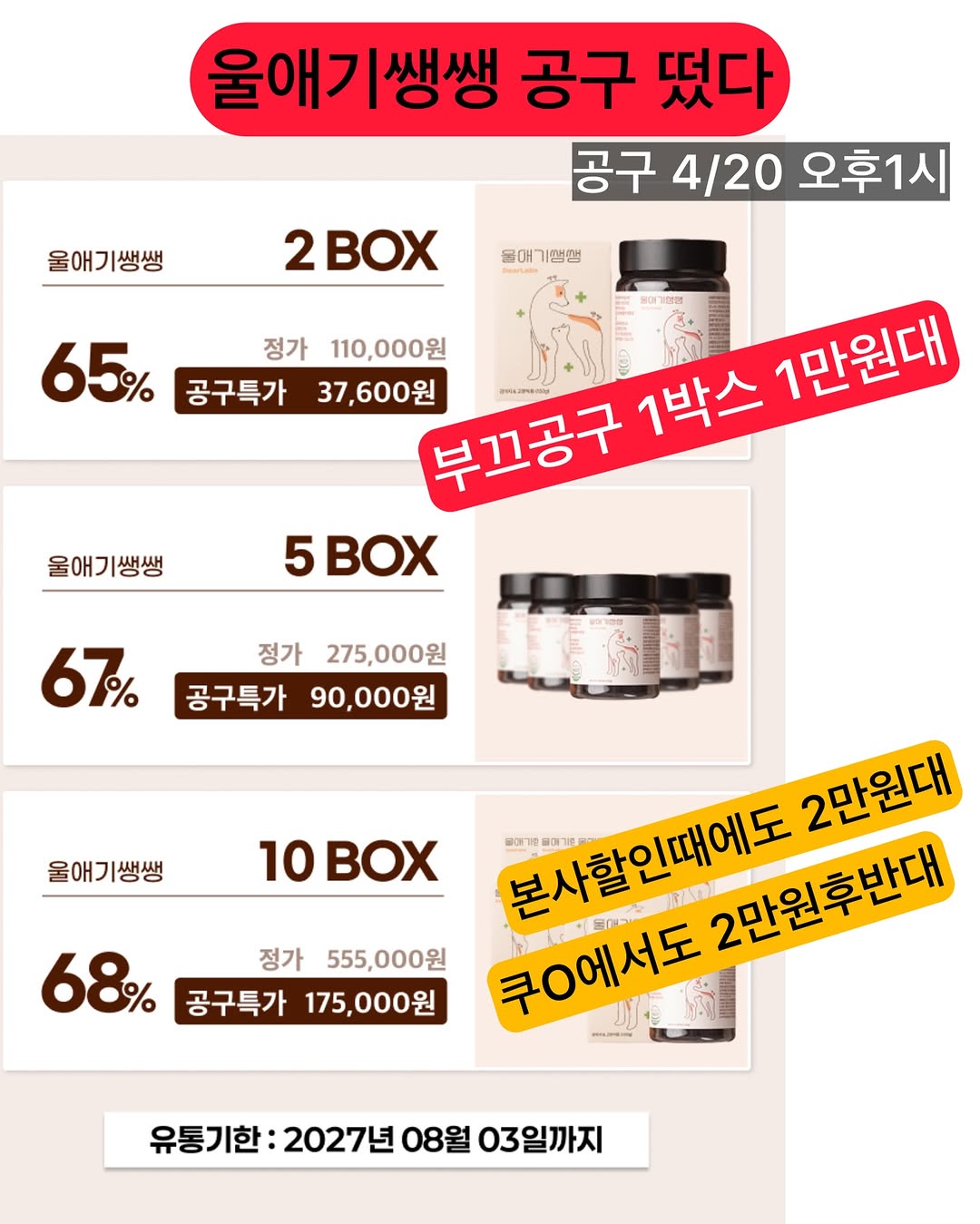 . 내일 드뎌 울애기쌩쌩 오픈됩니다 반년만에 오픈이라 떨어진분들 많을텐데 이번에 왕창 챙이세요 유통기한도 길고 이번공구 이후 가격이 20-30% 올라가요 여러번 말씀드렸는데 제 수수료 포기하면서 가격 지켜낸거니까 진짜 쟁이실분들은 잔뜩 쟁이세요 이후엔 이가격이 안되요… 이번공구 이후엔 8월입니다 🔥댓글에 “울쌩”남기시면 낼 오픈전에 알림 드릴께요 🔺4/20 오후1시 오픈 🔺디어랩스 전라인 (치실껌까지 모두) 🔺이벤트는 피드참고 •울애기쌩쌩 오리지날 - 종합영양제(강아지고양이 모두가능) •울애기쌩쌩 이너플러스 - 기관지,심장 영양제 (강아지고양이 모두가능) •울애기 유산균- 유산균7종 (강아지고양이 모두가능) •울애기쌩쌩 수제연어사료 - 생연어 스팀베이크드 사료 • 울애기쌩쌩 시니어 - 노 노묘 맞춤 항산화제 (신상) • 울애기스틱 - 울 액상형 (강아지고양이 모두가능) •울애기츄츄트릿 - 간식!! (강아지) • 울애기홀쭉 - 저칼로리 간식 (강아지) • 울애기 치실껌 • 울애기뽀송 샴푸 - 나노샴푸 피부 모질케어 (강아지고양이 모두가능) • 울애기뽀송 치약 - 나노치약 (강아지고양이 모두가능) • 울애기뽀송 귀세정제 - 나노귀세정제 (강아지고양이 모두가능) 🔥댓글에 “울쌩”남기시면 낼 오픈전에 알림 드릴께요 허스키 고양이 말라뮤트 슈나우저 비글 요크셔테리어 푸들 비숑 꼬똥드툴레아 치와와 웰시코기 사모예드 리트리버 진돗개 포메라니안 보더콜리 잉글리쉬쉽독 스피츠 도베르만 닥스훈트 시바이누 시고르자브종 페키니즈 말티즈