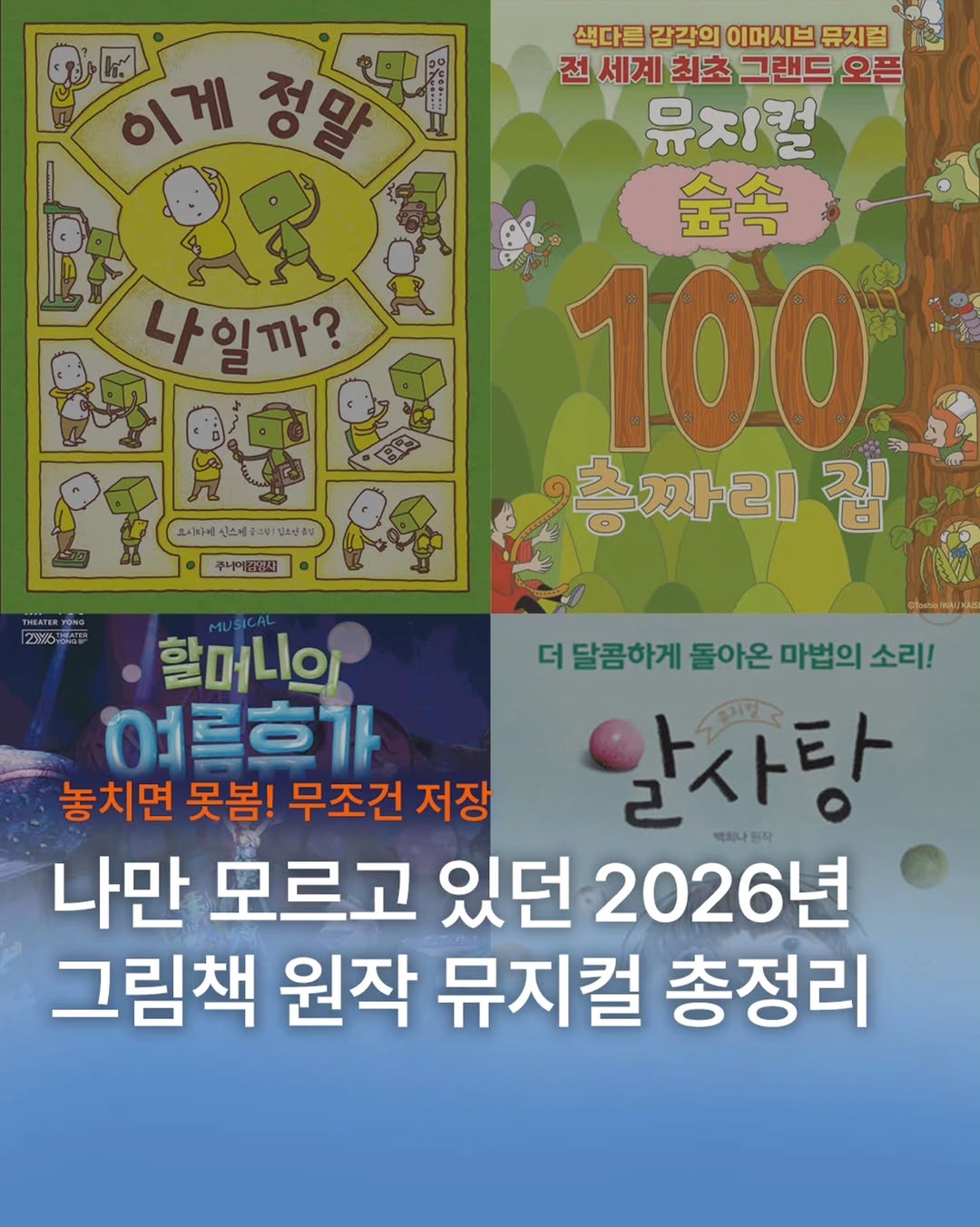 #광고 서울에서 하는 올해 뮤지컬 정리했어요❤️ 독서와 함께하면 효과가 두배👍 저장 해두시고 2026년 공연도 꼭 챙겨보세요. 저도 아이랑 보러 가고 싶어서 공개된 일정들 쭉 찾아 정리했어요~~~ ‼️가기 전에 꼭 원작 책 먼저 읽고 가셔요. 책으로 상상했던 장면들이 음악, 춤, 무대, 배우 연기로 눈앞에 펼쳐지면 아이의 상상력과 몰입감이 훨씬 커지더라고요. 📚 다녀와서 책 보며 상호작용 해주시면 훨씬 좋아요 책에 대한 좋은 기억 쌓기❤️ 📌그래서 🌳숲속 100층짜리 집도 책 먼저 보고 공연으로 이어갈 수 있게 🔥4월 23일(목) - 4월 29일(수)💚 공구로 같이 준비했어요! 책 읽고 공연까지 이어서 보면 아이들한테 훨씬 더 입체적이고 특별한 경험이 될거예요 ━━━━━━━━━━━━ 🚨🚨100층짜리 집 책 최저가 링크 필요하신 분들은 [알림] 달아주세요! 오픈당일 dm드릴게요 ━━━━━━━━━━━━ 📍예매 전에 체크하면 좋은 것! 우리 아이가 무서워할 장면은 없는지 큰 소리, 어두운 장면, 갑작스러운 등장 포인트가 있는지 확인하시고 아이와 충분히 미리 이야기 나눠주세요. 🎵 이번에 '이게 정말 나일까?'는 #협찬 을 받아 알게 됐는데 오히려 그래서 더 자세히 보게 되었어요. “나는 어떤 아이일까?”를 아이 눈높이에서 풀어내는 이야기라 보고 나서 아이랑 대화 나누기 좋겠다는 생각이 들더라고요. 하반기 일정은 아직 더 나올 수 있어서 공개되면 또 보기 쉽게 정리해볼게요 ✍️ 아이와의 문화생활도 @limlimworld_ 와 함께 해요 💛💛 #어린이뮤지컬 #이게정말나일까뮤지컬 #유아공연