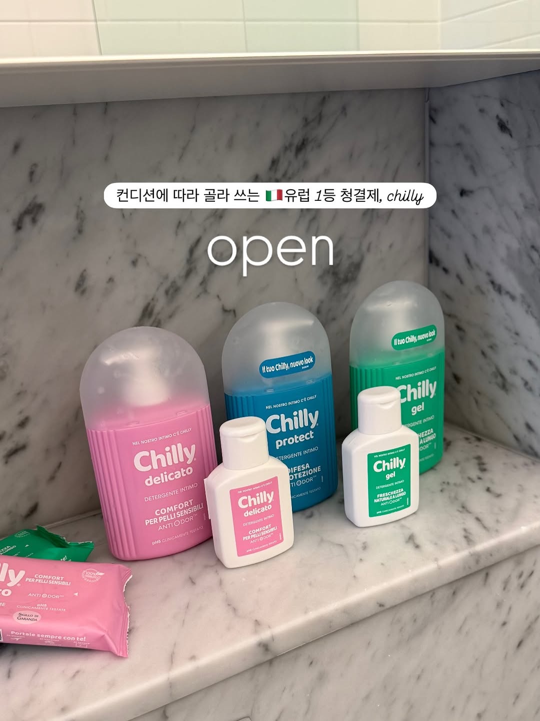 이탈리아 1위 여성청결제 Chilly. 민감한 Y존 케어를 위한 제품으로, 저자극 성분으로 구성되어 있어 매일 사용 가능. 다양한 향과 용량으로 제공됩니다.