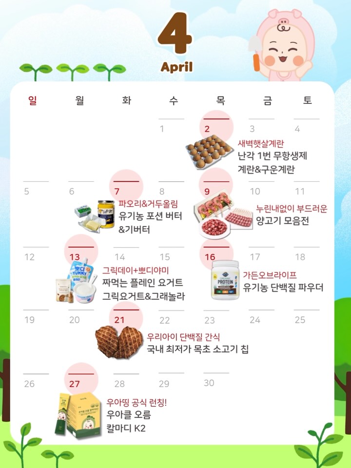 #이벤트 4월 공구일정 공유!🙏 📍 구매 예정인 제품에 댓글 달아주시면 알림 및 20분께 1만원 캐시백 해드립니다!!!!! 🧨 공구 놓치지 않는 법 3가지 1.프로필 링크에 ”문자알림받기“ 이용하시면 공구 오픈 당일 핸드폰 문자로 안내드릴께요! 2.프로필 링크 ”알림 단톡방“ 입장 3.인스타 계정 알림방 입장 해놓기 #새벽햇갈계란 난각번호 1번 무항생제 달걀 ✅공구기간 : 4/2(목) ~ 4/5(일) 성장기 아이들에게 필요한 영양소 ”콜린“ 계란은 콜린을 채워준다는 사실!! 난간번호 1번 계란으로 노른자가 탱글탱글 살아있는 “당일” 낳은 계란으로 바로 보내드려요!! #파오리 유기농 포션 버터 & #거두올림 목초방목 기버터 ✅ 공구기간 : 4/7(화) ~ 4/10(금) 국내 유일 유기농 버터! 첨가물 가득한 비싼 가공버터가 아닌 우유 본연의 맛을 최대한 살려 고소한 100% 유기농 원유 파오리 버터와 생산된지 일주일도 안된 신선한 기버터! 유당을 제거하여 유당불내증이신 분들도 편하게 섭취할 수 있어요! 비린맛 없이 찐-하고 고소하게 맛있어요! 누린내없이 부드러운 #양고기 모음전 ✅ 공구기간 : 4/9(목) ~ 4/13(월) 돼지고기, 소고기가 재정비에 들어갔어요! 이번달은 양고기만 진행합니다. 양고기 또한 아이들 성장에 정말 좋은 단백질인데요! 호주산 6개월 미만 방목 양고기 로 잡내가 적고 정말!!!! 맛있고 부드럽습니다. 19개월부터 성인까지 잘 먹는다는 후기가 넘쳐납니다!! 그릭데이 뽀띠야미&그릭요거트&그래놀라 ✅ 공구기간 : 4/13(월) ~ 4/16(목) 이벤트 반응 폭발적이었던 뽀디야미 요거트💕 요거트 산미 때문에 안먹는 아이들에게 딱이에요! 플레인 요거트와 그릭데이의 시그니처 꾸덕하고 찐한 그릭 요거트, 통곡물 그래놀라까지 진행하는 그릭데이 모음전🌟 가든오브라이프 단백질 쉐이크 3차! ✅ 공구기간 : 4/16(목) ~ 4/22(수) 드디어 3차로 돌아옵니다!🌟 재재공구 문의가 많은 제품 유청 단백이 없는 올 식물성 유기농 성분으로 한국인에 맞춰 재개발되어 수입된 프로틴이에요! 미국 판매 1위로 합성첨가물 없는 온가족 함께 먹는 프로틴! 아이들 단백질 간식 소고기칩 ✅ 공구기간 : 4/21(목) ~ 4/24(금) 소고기칩 공구하고 싶었지만 늘 마음에 가격이 비싸고…. 어떤건 아이들이 잘 안먹어서… 고민이었거든요. 피비린맛 없고 가격이 정말 착해요. 잡다한 첨가물이 들어간 시판 과자 대신 단백질 함량을 챙겨줄 소고기칩으로 주세요! 착한가격 대용량으로 가지고 올께요!! 우아클 오름 칼마디k2 런칭 ✅ 공구기간 : 4/27(월) ~ 5/1(금) 드디어 우아클 오름 칼마디k2 런칭! 한국인 영양소 섭취기준 기반 연령대에 맞는 알맞은 함량으로 제작되었어요! 칼슘 210mg 함유! 성장에 필요한 마그네슘100, 비타민D 1000, 비타민K50!! 폴리감마글루탐산 부원료까지!! 성장 필수 영양소 한곳에 담았습니다. 새콤달콤 사과맛 젤리형태로 거부감 없이 하루 1포로 영양소를 꽉꽉 채울 수 있어요! 최상급 원료에 첨가물 최최최소화 하였습니다! 많은 이벤트와 착한 가격으로 만나요!!!