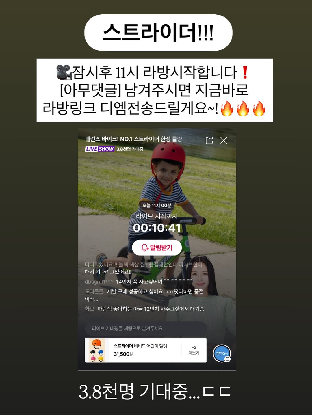 🚨잠시후 11시 라방 시작!!!🚨 🌟[아무댓글] 남겨주시면 라방링크 전송드릴게요! *설치영상 오픈피드에 댓글 남기시면 전송됩니다 (상세설명 내 링크 참조) ✔️자정물량품절되었으나 물량 분배를 해두었어요 👉🏻11시 라방 때는 좀 더 많은 물량이 채워질예정으로 우리 모두 성공합시다~!!!! ✅사이즈 팁? 아이 키가 95~98cm로 애매하다?하시는분들이 많아요 저도 엄마입장으로 충분히 이해합니다 오래태우고 싶잖아유ㅠㅠㅠ 팁) ✔️아이가 운동신경이 좀 있고 잘 버티고 적응 잘하는 편이다 14인치 가도 적응은 좀더 걸리겠지만 오케이 가능 ✔️근데 킥보드도 무서워하고 적응하는데 좀 걸릴거같다 욕심 버리고 12인치 가세요 무리해서 업하면 아이 힘들어해요ㅠㅠ 1년 정도 충분히 태우고 적응하다가 업그레이드 하셔도 중고 가격 방어가 잘됩니다 ✔️스트라이더는 당근에서 수요가 더 많아서 사기도 많대요 ㅠㅠ(실제 조동친구 언니 지인 사기당함 ㅠ) ✔️안전하게 할인받아 공구가로 구매하시고 방출하실때도 가격방어가 잘되니까 이부분도 체크포인트일것 같습니다🔥🔥 ✔️저희집은 아이 키 98cm 일때 14인치 들였지만 또 저희 조동친구 언니는 같은 키 기준 12인치 사서 1년 잘태우고 방출했다합니다 (이번에 14인치로 업글했다고🩷🩷🩷) 🔥아자아자 !!!🔥 지금바로 [아무댓글] 남겨주세요~! *앱구매 하셔야 적립금이 지급되며 적립금 혜택은 4/9(목) 오늘 단 하루에요 꼭 배너 클릭하셔서 신청하세요 (오픈피드에 댓글 아무거나 남기시면 상세 설명 디엠전송됩니다 / 피드 게시가 불가합니다)