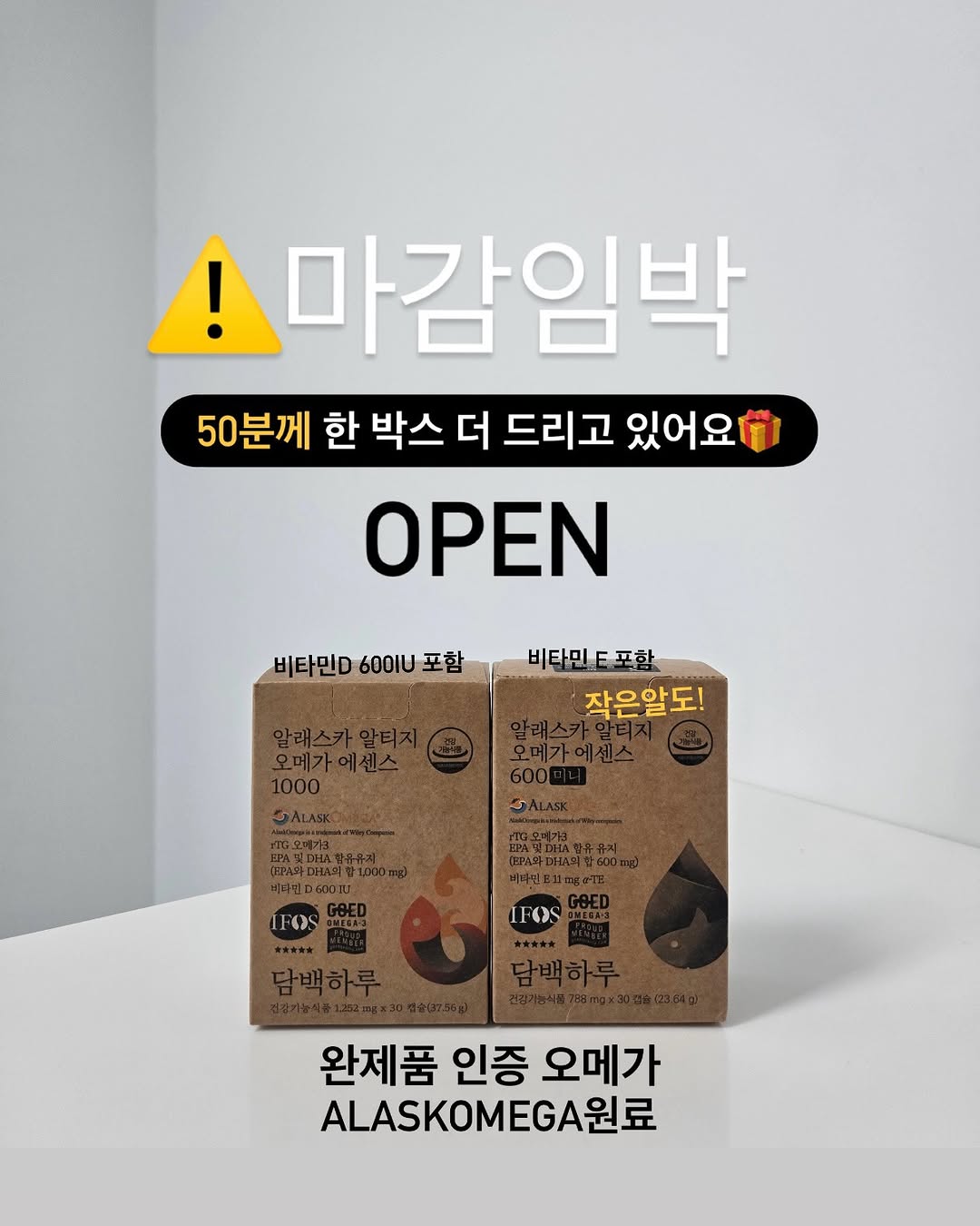 담백하루 알래스카 오메가3 에센스 + 미니 구매자 50분께 한박스 랜덤으로 더 배송드리고 있어요🎁 ⚠️이번공구에는 추가 할인율 반영된 20박스(600알) 구성이 추가되었는데 소비기한 29.01로 굉장히 길고, 미니도 28. 08로 넉넉하니 메가도즈 하시는 분들께 더 좋은 선택일듯 하구요! 3알 메가도즈 하시면 따로 비타민D는 추가하지 않아도 됩니다 세계적인 메이저 원료사 AlaskOmega사 원료로 완제품으로 방사능/환경호르몬/중금속/산패도 관리하는 제품✔️ 이번 주말 마감입니다🔥