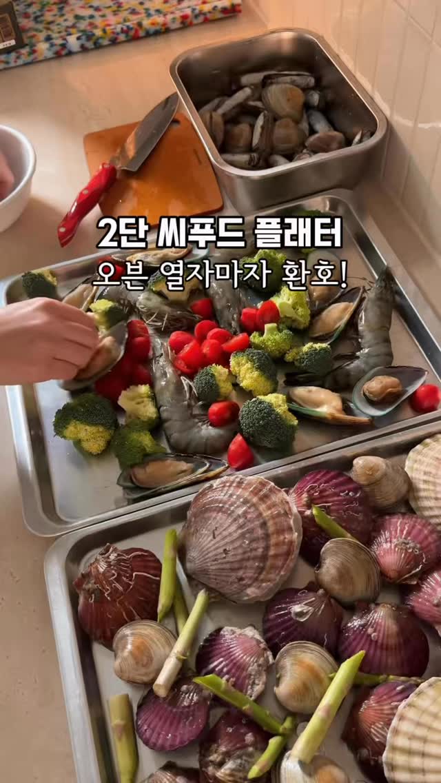 두판 더! 외치게 되는 해산물 플래터🦐🐙 💌저장 꾹 해두고 주말에, 가족파티에 손님 초대, 집들이에 맛있게 즐겨보세요! ✈️함께 먹고싶은 친구나 가족에게 공유 해보세요. 친정 부모님 오시는 날 해드렸더니 너무 좋아하시더라구요! 저는 엄마 앞에서 한식으로 까불지 않아요ㅋㅋㅋ 🐟재료 준비하기 가리비, 그린홍합, 대조개, 새조개 등 원하는 조개들, 새우, 브로콜리, 방울토마토 아스파라거스, 로즈마리 그린빈, 버섯도 좋아요. 재료는 큰걸 쓰시는걸 추천! 가리비, 조개는 표면을 솔로 박박 문질러 깨끗히 씻어 준비, 오징어나 문어를 넣으실땐 미리 맛술, 올리브오일, 소금, 후추에 버무려 팬에 담으세요. 오븐 팬에 푸짐히 담고 올리브오일, 소금, 후추, 바질가루 뿌려 250도로 미리 예열한 오븐에 180도로 15분 구워요. 재료의 크기에따라 시간 조절 해보세요! 도란도란 이야기 나누며 까먹는 재미, 손님초대에 1등메뉴 넘 쉽게! ⭕️영상속 오븐은 지에라 뉴브리옥스 스팀오븐 지금 @mom_e_gayo 프로필 링크에서 공구중! 내일 문닫을게요! 맛있게 드시고 힘찬 4월의 시작 되세요🙋♀️ #지에라오븐 #오븐추천 #해산물요리 #가리비구이