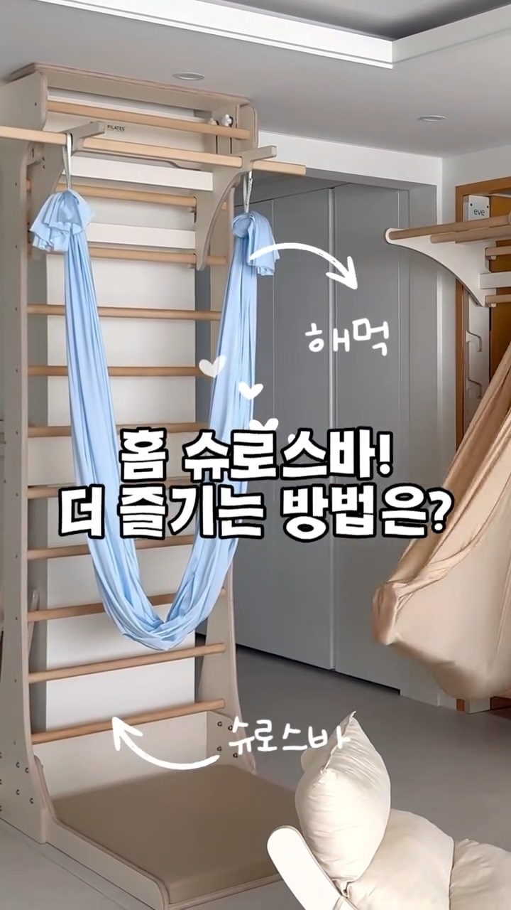 슈로스바+해먹 공구중🩵 문틀형 구매해주신분들도 이번에 슈로스바 구매해주신분들도 꼭꼭 해먹 추가하셔서 더 즐겨주세요🫣 그네처럼 타기도 하고 쏙 들어가서 나만의 아지트 공간으로 사용도 하고 엄마, 아빠와 운동도 가능합니다🙆🏻 국내생산으로 부드러운 소재에 탄성이 있고 안전하게 활용 가능하다는 점★ ★ ★ ★ ★ 슈로스바는 Q&A 따로 올려드려서 확인해보시고 타공 / 무타공 제품 중 더 맞으시는 제품 선택해주세요🙆🏻 벽 손상과 설치 가능한 벽이 있어야 된다는점과 한 번 설치 후에는 옮길 수 없다는 단점이 있지만 흔들림없이 견고하게 설치된다는 장점이 있는 타공형✔️ 설치가 안되는 벽이라도 월세, 전세인 집이라도 벽 손상없이 천장과 바닥만 있으면 설치되는 무타공형✔️ 벽과 바닥 압착형태로 완벽 밀착되는 구조로 안전 또 안전! 타공형과 무타공형 둘다 최대 하중은 110kg 각자의 다른 매력으로 둘 다 안전하게 설치 가능합니다:) 🪜많고 많은 브랜드 제품 중에 이브를 선택한 이유? ✅전국 필라테스 센터를 둔 믿을 수 있는 ✅10년 넘게 국내 자체제작 필라테스 기구 전문 브랜드 ✅SEO등급 친환경 자작나무 소재 ✅최대 하중 110kg으로 온 가족 함께 사용이 가능 ✅내구성 뛰어난 LG화학 친환경 ASA데코시트 마감 ✅깔끔하고 인테리어 해침없는 디자인 ✅집 안 공간에 맞게 원하는 컬러 선택 가능한 점 ✅퀄리티에 비해 합리적인 가격대! 🏷️진행구성안내 ♦️타공 슈로스바 ♦️무타공 슈로스바 컬러 ; 내추럴우드 / 밀키화이트 Set구성 ➟ 풀업바 set / 슈로아크 set 추가구성품 ➟ 원형그네, 테이블, 스프링키트, 클라이밍 슬라이더, 슈로아크, 아크쿠션, 아크웨지 구매는 @luvyul_home 프로필 링크🔗 #슈로스바 #철봉운동 #플라잉요가해먹 #아이있는집 #성장판자극