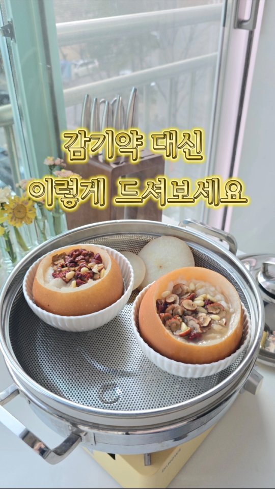 환절기라 그런지 투찬이들 기침이 더 심해지고 감기증상이 보여서 얼른 배중탕을 만들어줬어요ㅠ 감기약을 먹으면 학원가서 자꾸 졸린다는거에요 그래서 학원 가기 전에 배중탕을 미리 만들어서 먹이고 보냈더니 기침이 덜 나와서 훨~씬 좋았대요 어린 아가들 감기약 잘 못 먹는 꼬맹이들한테 만들어줘도 좋은 것 같아요♡ . ⭐️배중탕 레시피⭐️ 1.배는 뚜껑을 만들어주고 속을 파낸다. 2.파낸 배는 씨를 제거하고 배 속에넣어준다. 3.대추는 씨를 빼고 돌돌 말아준뒤 썰어서 넣어주고 잣이랑 생강도 조금 넣어준다. 4.꿀 2큰술 정도 넣어주고 뚜껑 닫아 그릇에 담아준 뒤 찜기에서 50분간 쪄준다. . 쉽고 간다한데 은근 효과가 있어서 좋더라고요 저희 애들은 생강을 싫어해서 생강은 뺐어요^^; 기침 많이 나올때 만들어서 드셔보세요♡ . ⚪️영상에 사용된 찜기는 알텐바흐 멀티케셀 통5중 파티웍 28cm 사이즈에에 배는 3개까지도 들어갈 것 같아요:) 지금 컬리에서 공구중이에요♡