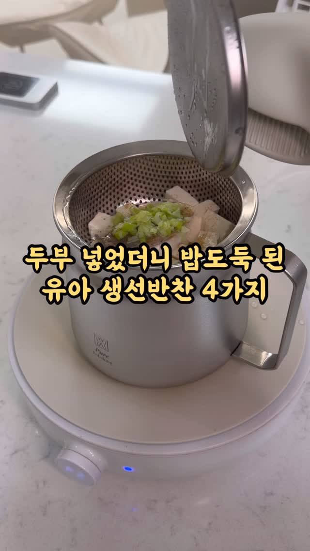 📍생선파는언니:미니찜기 공구중⬇️⬇️⬇️ ‼️생선파는 언니(4/2까지) ▫️강미즈 단독구성세트(도미,가자미,삼치) ‼️미니찜기 케틀찜팟(4/3까지) *더 자세한 제품정보&이벤트 참여는 각 오픈피드를 참고해주세요. ➖➖➖ 🙋🏻♀️안녕하세요:) 강미즈에요! 생선반찬 맛내기 힘드셨다면! 두부를 함께 사용해보세요! 두부의 담백하고 고소한 맛과 부드러운 식감이 생선과 정-말 잘 어울려 아이도 잘먹고 엄마가 조리하기도 쉬워요! 🏷️두부 순살 도미찜 1️⃣두부(1/4모)를 작은큐브 모양으로 썰어 키친타올로 물기제거 2️⃣찜망에 두부 깔고 >>순살도미>> 만능멸치야채 뿌린후 >> 잘게썬 파 올려 >> 중약불로 7분찌기 3️⃣접시에 담아 유아간장(1스푼),참기름(1스푼) 더해주기 🏷️두부 순살삼치조림 1️⃣두부(1/4조각)을 작은큐브 모양으로 썰어 냄비에 깔고 순살삼치(3조각) 올리기 2️⃣유아굴소스(3스푼),쌀조청(4스푼),파(한줌),물(80ml)넣고 중불로 팔팔 한번 끓여 비린내 날리기 3️⃣약불로 낮춰 뚜껑덮고 5분 익히기 4️⃣뚜껑열고 원하는 농도만큼 졸이기 🏷️두부 순살대구탕 1️⃣두부(1/4조각),계란(1개),만능멸치야채(소금보다 넉넉히)넣고 골고루 섞기 2️⃣물(250ml)에 만능멸치야채(1포), 순살대구(1조각)넣고 팔팔 끓어오르면 1번 계란물 붓기 3️⃣잘게썬 파(2스푼)넣고 마무리 🏷️두부 순살가자미전 1️⃣두부(1/4조각), 계란(1개)에 순살가자미(1조각)을 잘게 썰어 추가 2️⃣만능멸치야채(소금보다 넉넉히) 넣고 골고루 섞기 3️⃣팬에 오일 뿌린후, 반죽을 붓고 부추 약간 뿌려 노릇하게 굽기 오늘도 강미즈 유아식을 보러와주셔서 진심으로 감사해요❤️