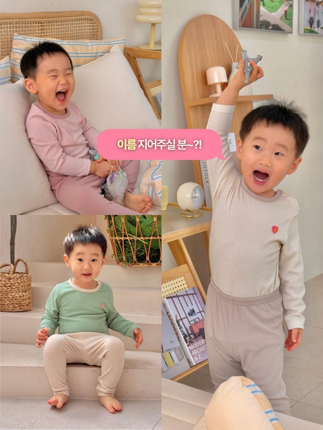 🎁 #이벤트 말랑츄 봄신상 이름, 같이 지어주실래요? 🌷✨ 이번 신상은 4가지 컬러로 소개드려요 :) 상세페이지 제작 중인데, 컬러명이 고민이 되어서 함께 지어보려고 이벤트를 준비했어요. 말랑츄의 말랑쫀득한 원단이 느껴지는 🩷귀여운🩷 이름을 지어주세요. 예를 들면, 이런 식으로요! - 베이지: 버터떡 - 핑크: 딸기우유 - 그린: 아보카도버터 - 그레이: 스님룩,,(진짜 이거 뭘로하죠 ㅠㅠㅋㅋ) 제가 쓴 이름이 귀엽다면 고대로 써주셔도 좋고 새롭게 제안해주셔도 좋아요! ㅎㅎ 🎁 이벤트 - 컬러별로 1명씩 뽑아 당첨된 컬러를 아기 사이즈에 맞춰 보내드릴게요 :) - 4컬러 모두 마음에 든다면, 1개 컬러당 1개 댓글씩 총 4개 댓글로 참여해주세요. <<말랑츄 26ss 봄신상 OPEN 일정>> 🎀 3/24(화) 오전 10시부터 3일간 런칭 특가 🎀 달콤이 직접 세탁/건조/미싱 해보며 고른 말랑쫀득한 원단 🎀 백화점 실내복 제작하는 아기옷 대형 공장에서 제작 🎀 고가 브랜드에서 사용하는 말캉한 허리밴드 사용 🎀 목늘어남 없는 똑딱이 공정 추가 ✔️4가지 컬러 ✔️4가지 사이즈(80.90.100.110) 사이즈는 백화점 사이즈에 맞춰 제작했어요. 평소 구매하시는 사이즈로 선택해주세요 :) ───────── 🌷말랑츄 찐팬들을 위한 업그레이드 사항 미리 공유,, 🌷 26ss 봄신상 실내복 역시 정.말. 잘나왔어요. 25fw 말랑츄 아기실내복의 말캉쫀득함은 살리고 원단 두께만 미세하게 얇아져 한여름 빼고 사계절 내내 쾌적하게 입힐 수 있게 제작했거든요. 더 자신있어진 부분은 원래도 자신있었던 허리밴딩! 작년 버전도 엄격하게 고르고 골라 말캉함이 남달랐는데요, 이게 최선인가 확신을 얻기 위해 동대문의 고무줄 가게를 여기저기 다니며 백화점 고가 브랜드에서 많이 사용하는 밴딩을 찾아내 업그레이드했고요, 덕분에 좀 더 말캉해진, 최상의 말캉함을 느끼실 수 있을거예요 :) (뱃살 낭낭한 아가들, 배쪼임 없이 지구최강 편함 보장,, 🩷) 그리고 이지컷 케어라벨을 떼어내면 특히 바지 앞뒤 구분이 어렵다는 분들을 위해 뒷면에 라벨을 주문해서 추가로 부착했어요. 물에 팍팍 삶아도 이염이 없는지 세탁테스트까지 완료!🫡 다만,, 이번 봄신상은 각 사이즈별 수량이 매우 적어요,,🤫 80사이즈가 추가되면서 기존 90/100 사이즈 수량이 좀 줄었거든요. 오픈런 추천드립니다 ,, 🤫 👩🏻💻 이 피드 댓글이벤트 참여해주신 분들께 오픈날 알림 드릴게요! 인스타 알림 놓칠 것 같은 분들은 제 프로필 링크의 공지카톡방에 들어와주세요 :) #말랑츄 #아기실내복