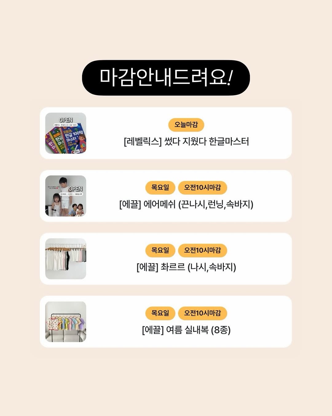 #마감임박 잠시후 마감하는 제품 안내드려요🚗 햇살이 점점 따뜻해지고 아이들 옷차림도 가벼워지는 요즘이에요! 본격적인 무더위 오기 전에 여름 준비, 미리 해두시면 훨씬 편해요♥️ ✅ 오늘 마감 [레벨릭스] 썼다 지웠다 한글마스터 ✅ 목요일 오전 10시 마감 [에끌] 에어메쉬 (끈나시, 런닝, 속바지) [에끌] 최르르 (나시, 속바지) [에끌] 여름 실내복 8종 여름 시작되면 사이즈 빠지고, 품절도 빨라서 미리 챙겨두셨던분들이 가장 여유롭더라구요🥹 필요하셨던 제품들 천천히 둘러보시고 담아가세요! 언제나 저와 함께 해주셔서 감사합니다🙇🏻♀️