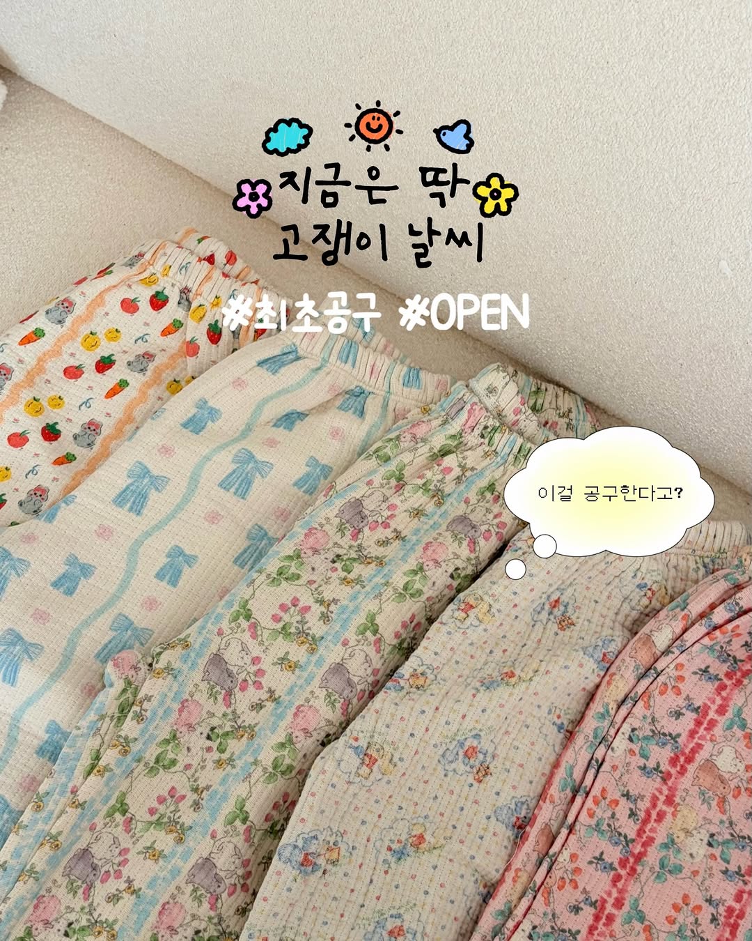 오늘밤10시OPEN #디자인&핏 넘사 고쟁이🫣 고쟁이가 빛이 나는 계절이 왔어요😎 ─── 💬최저가링크는 ‘링크’ 적어주시면 DM으로 보내드려요 🎁구매완료 이벤트 구매 후 구매완료 + 구매자 핸드폰번호 뒤4자리 댓글 달아주세요. 추첨을 통해 보냉파우치 보내드릴게요 ─── 👉🏻3중 거즈원단으로 빨래 몇 번에 망가지는 재질 아니고 👉🏻통기성 좋은 원단이라 여름에도 OK 이런 디자인&핏 어디서도 못보셨을텐데 대표님 조르고 졸라 데려왔어요🥹 깔끔한 디자인 선호히는 저도 너무 귀여워보이면서도 과하지 않은 패턴🎀 핏도 적당한 항아리핏에 너무 흐물거리지 않고 퐁신퐁신 너무 귀여워요🥹 📌사이즈는 97cm 아인이는 XL 73cm 아준이는 M사이즈로 한 사이즈업해서 입었고 세탁 몇 번 하니 딱 맞아요 :) * 더 다양한 사이즈 상세페이지 맨 하단 꼭 참고해주세요 📌 고쟁이는 고온세탁&건조에 취약한 소재에요 통기성이 좋아 금방 마르니 찬물세탁 & 자연건조 추천드려용🙌🏻 세탁 할수록 패턴이 미세하게 흐려질 수 있어요 아인이네는 이번패턴 입은지 2달 지났는데 아직은 괜찮았어요! 🚚 7만원 이상 무배 한장으로 끝나는게 아닌 제품이라 3장 추천😇 배송은 넉넉히 4-6일 안으로 보내드려요!