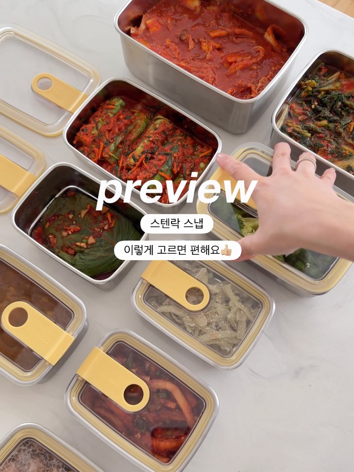 #스텐락스냅 #내일오픈 ✔️댓글에 #스냅 이라고 남겨주시면 가격과 구성 미리보기 링크 디엠으로 보내드릴게요! 스텐락에서 새로 나온 스냅 라인이에요💛 디자인도 너무 예쁘고 깔끔하지만 써보니까 제일 편했던 건 뚜껑 열고 닫는 거였어요👍🏼 사방에 날개가 없어서 편하고 한 손으로도 쉽게 열리고 닫히는데 밀폐까지 잘 돼서 김치를 담아도 냄새 걱정 없더라구요 스텐 쓸 때 제일 불편했던 게 안이 안 보인다는 거였는데 스냅은 뚜껑이 투명하니까 열어보지 않아도 바로 확인돼서 편하구요 스텐이라 가볍고 변형도 적어서 데일리로 쓰기에도 오래 두고 쓰기에도 좋은 반찬통이에요✨ 사이즈는 총 6가지입니다. 3/4호는 양 적은 반찬용 5/6호는 진미채, 샐러드처럼 자주 먹는 반찬용 7/8호는 김치나 겉절이 덜어두는 용으로 필요에 따라 나눠 쓰면 더 편하실거예요~ 단품 / 세트 모두 준비되어 있고 세트는 라이트 / 데일리 / 풀 구성이니 평소 쓰는 용도에 맞게 미리 생각해보셔도 좋을 것 같네요! 스텐락 스냅 내일 오전 11시 오픈합니다❣️ 🎁 선착순 이벤트 있어요! (20분께 스텐락 스텐도마 증정)