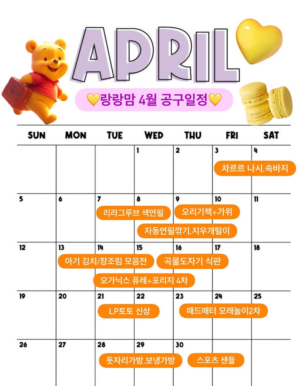 📌 알림 원하시는 항목 댓글로 남겨주세요! 💛4월 랑랑맘 공구일정💛 아래에서 확인하세요↷✎ 👇👇👇👇👇 ⠀ ⠀ 날씨 완전 봄이죠🌸 이번달 4월은 등원생활 적응 끝난 우리 아이들 생활템 + 학습템 + 먹거리 + 봄나들이템까지 한 번 더 정리해주는 달이에요💛 엄마는 더 편해지고, 아이들은 더 잘 먹고, 잘 쓰고, 잘 놀 수 있게 이번달도 실사용템으로 꽉 채워왔어요🫶 ⠀ ⠀ ⠀ •┈┈┈•┈┈┈•┈┈┈ ⠀ ⠀ ~4.3(금)까지 💛비더마틱 비건 선크림 눈 안 매움 + 순함 + 차단력까지 랑랑맘 최초공구 1+1 (개당 8천원대🔥) 온가족 같이 쓰는 선크림이에요 👉 알림 원하시면 “선크림” ⸻ 4.3(금)~4.6(월) 💛차르르 나시 / 속바지 이제 내복 벗고 나시 입혀 등원해야죠 프리미엄 소재인데 가격 실화… 나시 3천원대 / 속바지 2천원대 이건 무조건 쟁이셔야 해요 👉 알림 원하시면 “나시” ⸻ 4.7(화)~4.11(토) 💛리라그루브 색연필 모음전 두돌 지나면 색연필 레벨업! 구멍 뚫려있어 잡기 쉽고 3가지 두께로 아이 성장 맞춤 선택 발색 진짜 좋아요👍 👉 알림 원하시면 “색연필” ⸻ 4.8(수)~4.12(일) 💛자동연필깎이·지우개청소기 연필 쓰기 시작하면 필수템 자동으로 깎고, 가루까지 정리 끝 리라그루브랑 같이 쓰면 최고 조합 👉 알림 원하시면 “연필깎이” ⸻ 4.9(목)~4.11(토) 💛오리기책 + 가위 소근육 발달 + 집중력 + 창의력까지 요즘 시기 딱 필요한 놀이템 안전가위도 같이 드려요✂️ 👉 알림 원하시면 “오리기” ⸻ 4.13(월)~4.16(목) 💛베리쿡 순한 김치 / 장조림 랑랑이가 너무 잘 먹는 베리쿡 순한 김치 + 장조림 시리즈 깔끔하고 맛있어서 밥반찬 걱정 끝 👉 알림 원하시면 “베리쿡” ⸻ 4.14(화)~4.16(목) 💛오가닉스 퓨레 + 포리지 등원 전 간단하게 먹이기 최고템 건강하고 든든하게 한 끼 해결 이미 꾸준히 찾게 되는 아이템이에요 👉 알림 원하시면 “오가닉스” ⸻ 4.15(수)~4.17(금) 💛곡물도자기 식판 곡물 소재라 안심 + 묵직해서 안정감 이 식판 쓰면 더 잘 먹어요 진짜 한 번 쓰면 계속 손가는 식판 👉 알림 원하시면 “식판” ⸻ 4.21(화)~4.24(금) 💛LP토토 신상 어린이날 선물 추천! 6개월만에 돌아온 2차 공구 랑랑이 최애 오디오 장난감 듣고 고르고 감각 키워주는 찐템 👉 알림 원하시면 “LP” ⸻ 4.23(목)~4.26(일) 💛매드매터 모래·테이블 2차 어린이날 선물 추천! 품절됐던 모래놀이템 다시! 구성 더 좋아져서 2차 진행해요 집에서 매일 모래놀이 가능템 👉 알림 원하시면 “모래” ⸻ 4.28(화)~5.1(금) 💛플레이조이 피크닉 모음전 접으면 가방, 펼치면 돗자리 아기랑 봄 나들이 신박템! 그리구 여름엔 데일리로 들구나니는 보냉백도~ 디자인 예뻐서 맨날 들게될걸요♡ 👉 알림 원하시면 “피크닉” ⸻ 4.30(목)~5.3(일) 💛쿨링 스포츠 샌들 여름 대비 미리 준비하세요 가볍고 시원하고 어떤 옷에도 잘 어울림 가격까지 착한 완벽 샌들 👉 알림 원하시면 “샌들” •┈┈┈•┈┈┈•┈┈┈ ⠀ ⠀ 이제 완전 봄🌸 나들이·여행·야외활동 시즌 시작이에요💛 2026 4월도 랑랑맘과 함께 육아팅 🙌 날씨 좋아지니까 더 바빠지는 엄마들… 화이팅입니다 ^^♡ 📌 원하시는 항목 댓글 남겨주시면~ 오픈시 알림 따로 챙겨드릴게요 😎