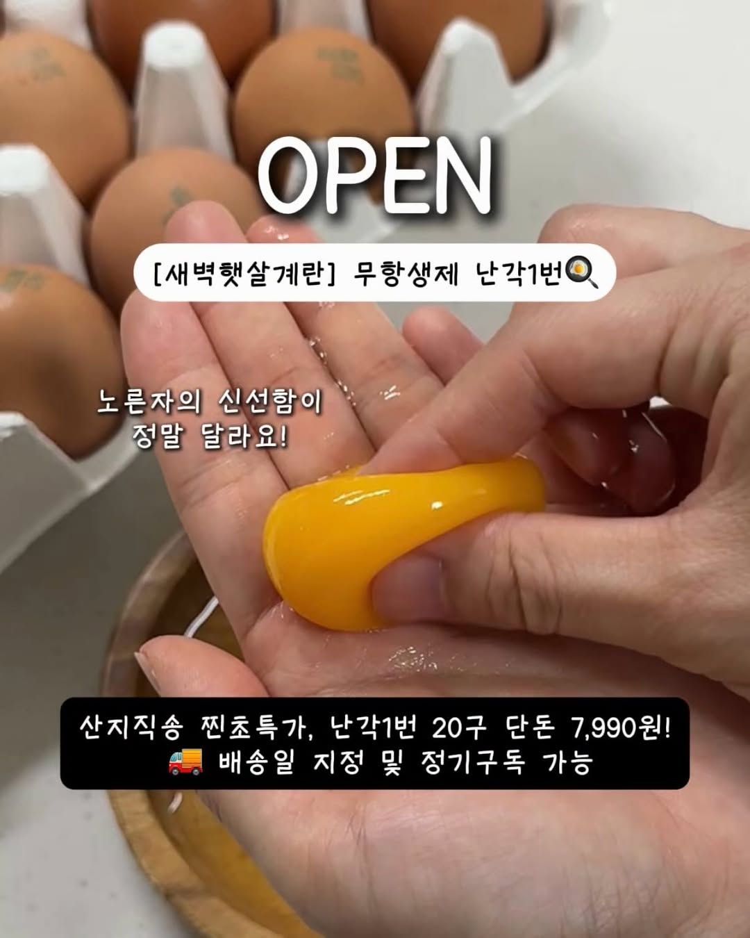 #공구오픈 [링크]남겨주시면 최저가링크 보내드려요! 🎁구매완료이벤트🎁 구매 후 댓글에 [구매완료]를 남겨주시면 추첨을 통해 2분께 [난각1번 20구]를 선물로 보내드릴게요! (또후니맘 태그 후 스토리, 피드 인증시 당첨확률 UPUP) ——————————————— 난각1번 계란은 구하기도 어려운데 이가격이라구욧?! 진짜 어디서도 볼 수 없는 초특가인만큼 아묻따 놓치지 마시고 꼭 담아가셔야해요♥️ ➡️ 20구 : 7,990원 / 40구 : 15,980원 / 60구 : 23,970원 🚚 배송일 지정을 희망하신다면, 프로필 링크 하단에 있는 [산지톡 카카오톡 문의하기]쪽으로 문의부탁드립니다! 궁금하신점 있으시면 언제든 저에게 디엠주세요💌 ——————————————— 또후니네는 계란을 좋아해서 거의 매일 먹다보니 60구도 순식간에 후루룩 없어지더라구요! 건강한 계란 부모님께도 보내드리면 정말 좋아하실거에요☺️ 매공구때마다 친정&시댁 양가에 보내드리고 있는데 이제는 마트계란 못드시겠다고 매번 공구만 기다리세요~ —————————————————— 공구때마다 주문건수 🔥1,000건 이상🔥으로 주문폭주!!! ▪️이렇게 신선하고 탱글탱글한 노른자는 처음 봤어요 ▪️계란 퉤퉤 하던 아이인데 요 계란은 싹싹 완밥했어요 ▪️부모님께서 너무 좋아하셔서 재구매하고 싶어요 찐만족 후기와 재공구문의가 끊이지 않는 [새벽햇살계란] 1달만에 13번째 공구로 다시 찾아왔어요🥚 ——————————————— 아직도 마트에서 계란 사시는 분들 계신가요? [새벽햇살계란]을 알기전까지는 저도 마트에서 구매했는데 공부하고나니 우리아이에게 먹일 수 없겠더라구요😭 마트에서 흔히 볼 수 있는 계란은 사육환경번호가 3번과 4번으로 케이지에서 자란 닭의 낳은 계란이에요! ▪️A4용지만한 좁은 케이스에 갇혀 ▪️평생 땅도 못밟고 햇빛도 못보고 ▪️스트레스만 쌓여 면력이 낮아지고 ▪️각종 해충과 진드기에 취약하기때문에 ▪️살충제/항생제/성장촉진제를 사용할 수 밖에 없고 ➡️ 이를 우리가 고스란히 먹게된다는 충격적인 사실‼️ 이런 사실을 알고 나니까 더욱 먹일 수 없죠😰 앞으로는 건강한 닭이 당일 새벽에 갓 낳은 신선한 계란인 [새벽햇살계란]으로 온가족 함께 드세요! ✅ 충남 당진 양계장에서 자유롭게 자연방목하여 기른 닭 (*AI(조류인플루엔자) 특별방역지침으로 잠시 실내방사중) ✅ 항생제❌ 살충제❌ 성장촉진제❌ ✅ 건강한 닭이 당일 새벽에 낳은 계란 ✅ 산지직송으로 역대급 최저가로 가져왔어요! 고단백 프리미엄 곡물만 먹으며 자랐기때문에 비린맛 없이 찐-한 고소함을 느낄 수 있고 새벽햇살달걀은 0.1% 자유방목농장으로 보장해요! 아무리 손으로 꼬집고 문지르고 들어도 말짱하고 이쑤시개를 콕콕콕 잔뜩 꽂아도 전혀 끄떡없을 정도로 최고로 신선한 계란으로 자신있게 추천드려요✨ 또후니랑 딸기는 요걸로 스크램블만 해줘도 코박고 먹을 정도로 좋아해요! (꼬소함이 가득) 저희 남편도 먹어보니 다르다면서 이제는 요것만 찾아요! 이번기회에 저렴한 가격으로 꼭 드셔보셨으면 좋겠어요🙇🏻♀️ ——————————————— 📣 AI(조류인플루엔자) 특별방역지침관련해 안내드립니다! 최근 겨울철 철새 이동이 많아지는 시기로 정부에서 국내 모든 농장에 대해 AI(조류인플루엔자) 특별방역지침을 시행하게 되었고 이에 따라 평소 마당과 들판에서 자유롭게 지내던 난각1번 닭들이 겨울을 맞아 이번 공구부터는 잠시 실내방사로 전환된 상태입니다🐔 ➡️ 하지만 새벽햇살계란의 난각번호는 변함없이 1번이며, 닭들이 지내는 환경도 난각1번 기준에 맞춰서 최대한 넓고 쾌적하게 유지되고 있다는점 안내드립니다☺️ ——————————————— 📍공구기간 : 4월 24일(금)-30일(목) / 7일간 📍구매방법 : 프로필(@ddohuni_mom)링크통해 구입가능 📍배송안내 : 주문일로부터 2-3일뒤에 출고예정 #난각1번 #난각1번계란 #난각1번달걀공구