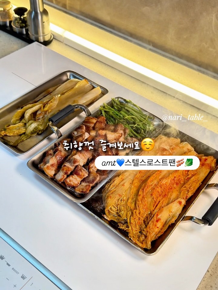 이번 💙amt 신상 모두 핫템 오브 핫템이지만 스텔스 로스트팬‼️ 정말 매력만점 팬 아닌가요? ✔️식장 네장이 자로잰듯 딱 맞게 떨어지는 사이즈 여기에 길거리토스트는 맞춤 제작한것처럼 구워지구요🥪 ✔️넓적한 식사빵 구워내는 브런치팬으로도 완벽✨ ✔️팬을 샀더니 트레이를 두개나 주는 스텔스로스트팬! ✔️트레이는 토스트프레셔, 접시, 밧드까지 열일하고! ✔️아니, 삼겹살을 구웠더니.???!!!!! 구워진 삼겹살, 미나리 트레이에 딱 올려서 따땃하게 유지해주고 남은 삼겹기름에 김치 구워서 잡솨봐봐요….🥓🥬😋 잘 들인 팬 하나로 우리집 식탁이 얼마나 풍성해지는지 모른답니다🥰 매력적인 스텔스로스트팬‼️ 나리테이블 공구가 끝나면 가격인상되니 절대 놓치지마세요👌🏻 #나리테이블 #amt #오늘의집