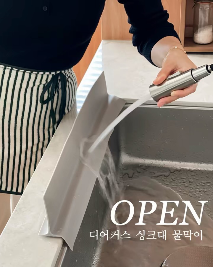 💛디어커스 싱크대 물막이 공구예고 설거지 할때마다 워터파크 개장...😅 처마형 구조로 물튈 걱정없는 디어커스 싱크대 물막이! 스탠다스 사이즈도 함께 공구 준비했어요✨ 한옥 처마 구조에서 아이디어를 얻어 물이 자연스럽게 안쪽으로 흘러가도록 설계된 물막이에요 그래서 물이 고이지 않고 물때도 덜 생기는 구조라 사용하면서 훨씬 깔끔한 느낌이에요✨ 설거지할 때 앞으로 튀는 물을 막아줘서 옷 젖는 불편함도 줄어들고 싱크대 앞 바닥이 물바다가 되는 것도 확실히 줄어들더라구요 흡착판 구조도 탄탄해서 사용하다 보면 쉽게 떨어지지 않는 점도 만족스러운 부분이고요💚 항균 실리콘 소재라 위생적으로 사용할 수 있고 열탕 소독이나 식기세척기 사용도 가능해서 관리도 편한 편이에요 스탠다드 사이즈도 추가돼서 싱크대에 맞게 선택하기도 더 편해졌어요 곧 오픈할게요😎 🔔빠른구매 원하시면 흔적 남겨주세요 좋아요❤️로 알림 드릴게요 :)