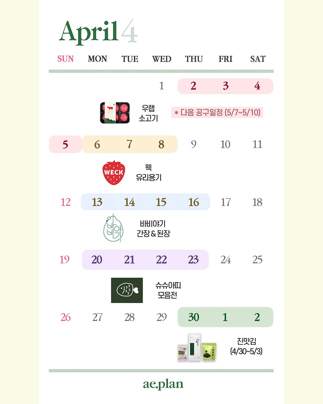 4월 일정 알려드려요♥ (3월 이벤트 당첨 : 4월 첫째주에 발표할게요!) ➡️기대되는 제품 댓글로 남겨주시면, 1. 공구 오픈 전에 알려드리고, 2. 추첨을 통해 10분께 네이버 포인트 5천원 보내드릴게요 (각각 댓글 남겨주셔야 당첨 확률이 올라가요) 감사합니다♥️ ▫️▫️▫️▫️▫️▫️▫️▫️▫️ ✅우랩 한우 🗓️4/2일 오전 10시 ~ 4/6일 오전 10시 마감 한 달에 한 번 돌아오는 우랩♥ 프리미어 아기 한우 우랩은, 다짐육부터 구이•불고기•국고기까지 종류가 다양해요! 아기밥 어떻게 먹여야 할지 늘 고민이라면 우랩 한번 꼭!! 들여보세요☺️ 밥태기를 우랩으로 극복했다는 분들 정말 많으시죠 저도 매 달 우랩 주문하고 있는데, 매번 어쩜 이렇게 품질이 좋은지..! 정말 후회 안 하실거예요♥️ ——————————————— ✅웩 유리용기 🗓️4/6 오전 10시 오픈 ~ 4/8 자정 마감 드디어..! 126년 전통 유리 용기, 웩이 옵니다♥ ♥ ♥ 제 영상에서 정말정말 많이 보셨죠! 오래 써보고 자신있게 소개해 드리는 제품이예요 웩은 사이즈도 다양해서 내가 필요한 구성으로 알맞게 고를 수 있는데, 종류가 많아서 선택에 어려우실까봐 특별히! 애플랜 세트 구성으로도 만들어 왔어요♥ (애플랜 세트 구성 외, 2개 구성도 있어요^^) 이•유아식부터 일반식까지 쓸 수 있는 환경 호르몬 없는 유리 용기! 10년 넘게 오래오래 쓸 수 있는 웩 유리용기 담아가세요💛 ——————————————— ✅바비야기 🗓️4/13 오전 10시 오픈 ~ 4/16 자정 마감 아기간장 된장 어떤 제품 쓰는지 문의 정말 많이 주셨는데, 제 레시피 오래 보신 분들은 다 알고계시죠!☺️♥️ 정말 오래 써보고 자신있게 소개해드리는 바비야기 제품들! 바비야기 제품들은 성분표를 보면 정말 놀라실텐데요! 원재료에 충실하면서 맛까지 좋은 아기 간장과 된장, 아기 첫 김치들까지 다양하게 보여드릴테니 기대 많이 해주세요🧡 ——————————————— ✅슈슈아띠 모음전 🗓️4/20 오전 10시 오픈 ~ 4/23 자정 마감 ‼️3월 일정에 댓글 적어주신 분들도 오픈 후 알림드릴게요!😘 봄철 맞이 아기 도시락과 이•유아식 필수 준비물인 멀티볼/흡착볼부터 어린이집 간식 가방인 미니 보냉백, 도시락 가방까지! 인기 좋았던 슈슈아띠 제품들을 한 번에 볼 수 있는!! 흔치 않은 기회예요❤️🔥 흡착볼 새로운 색상도 나왔는데 실물이 더 예뻐요 꼭 담아가세요 ㅎㅎㅎ 세트 구성도 준비 중이구요! 세트 할인가와 다양한 이벤트도 준비 중이니, 다른 곳에서는 이렇게 모음전으로 볼 수 없으니 이번 기회에 꼭! 저렴하게 득템해가세요♥️ ——————————————— ✅진맛김(5월 선물세트/반장김•진맛김•돌자반) 🗓️4/30 오전 10시 오픈 ~ 5/3일 자정 마감 5월 가정의 달에 선물 하기 좋은 진맛김 선물 세트가 옵니다!!♥ ♥ ♥ 게다가 무염 아가들이 정말 좋아하는 바삭한 반장김(무염), + new! 새로 출시된 완장김(무염), 온 가족 함께 먹기 좋은 신선한 진맛김(조미)과 바삭한 돌자반(조미)까지 골고루 챙겨올게요 진맛김으로 선물 세트부터~아기김 고민까지 한 번에 끝내세요🖤 ▫️▫️▫️▫️▫️▫️▫️▫️▫️ 감사합니다!❤️ #우랩 #웩 #바비야기 #슈슈아띠 #진맛김