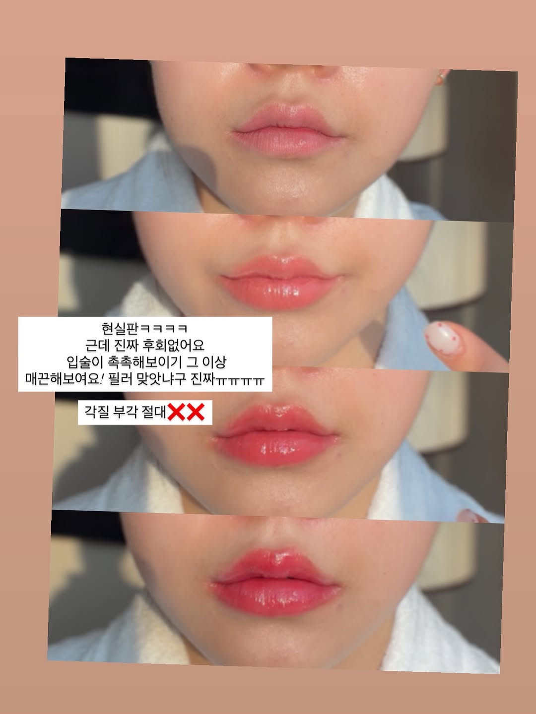 입술이 그냥 촉촉해 보이는 정도가 아니라 매끈해 보이는 광이 올라와요. 필러 맞았냐고 물어볼 정도… 진짜ㅠㅠ 각질 부각 절대 ❌❌ 요즘 립제품 잘못 바르면 각질만 더 도드라져 보이잖아요? 근데 이건 오히려 입술을 더 매끈하게 보이게 하는 광택이라 바르면 그냥 입술 상태 좋아 보이는 느낌! 그래서 요즘 제가 계속 바르는 필러 립밤 컬러 3가지 보여드릴게요! 2호 애프리콧 코랄 🍑 가장 자연스럽고 입술이 건강해 보이는 컬러 생얼에도 딱 좋아서 저는 톤업만 바를 때 이거 발라요. 3호 피그로즈 🌹 화장 / 생얼 상관없이 입술을 가장 생기 있어 보이게 만드는 컬러. 뮤트톤 좋아하시는 분들 이거 진짜 좋아하실 거예요. 1호 체리레드 🍒 화장 빡 했을 때 입술 색 진하게 살리고 싶을 때. 포인트 주기 좋은 컬러! 3가지 그냥 다 쓰는 거 추천.. 그리고 단점 하나 말하자면 처음 바르면 살짝 쫀쫀한 느낌 있어요. 근데 이게 끈적임이라기보다 입술에 수분을 사르르 잡아주는 밀착감 광택 올라오면서 입술 볼륨이 자연스럽게 살아나요. 플럼퍼 ❌ 광택 볼륨 ⭕ 바른 날이랑 안 바른 날이랑 입술 볼륨 차이 너무 나요ㅠㅠ ⭕️샵한현재 필러립밤! 23일 00시 마감입니다!