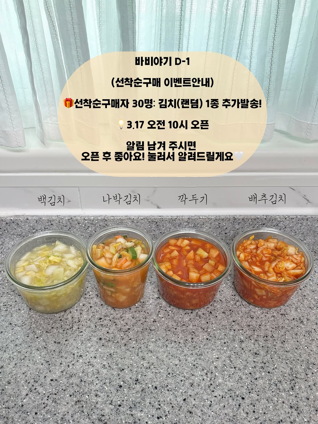 바비야기 d-1 안녕하세요 효둥맘입니다 주말 후욱〰️ 지나가고 다시 한주 시작이네요🤍 내일은 오전 10시 바비야기 오픈 일인데요 선착순이벤트 안내 드리고 진행되는 김치랑 장류 미리 간략하게 소개해드릴게용☺️ ✅오픈 후 선착순 이벤트 ⭐️선착순 구매 30명 김치(랜덤) 1종 추가발송⭐️ ✅3.17 오전 10시 오픈 ▪️저염 순맛간장 시중 대부분 간장은 콩껍질(탈지대두)로 만들어요 거기에 올리고당,정제당,첨가물 섞어서 만든 인공적인 간장맛 순맛간장은 한식간장베이스에 국산콩으로 만든 진짜간장! -한식간장베이스(국산콩 100%) -정제당 X 첨가물 X -오직 야채,과일만 넣고 10시간 고아낸 맛간장 -첨가물 없기 때문에 꼭 냉장보관 해주세요 -non gmo 100% 유기농 백태 -국,나물,조림,비빔 다양하게 조리 가능해요 ▪️저염 순맛된장 재래식 된장 특유의 냄새를 줄이고 미소된장의 특성을 보안한 아기 쌀된장 쌀 누룩가루와 메주가루 사용해 짠맛은 줄이고 부드럽고 자연스러운 맛이 올라와요 된장 특유의 쿰쿰한 향이 없어서 아이들 거부감 없이 잘 먹어요 -100% 유기농/미네랄소금/밀가루,첨가물X -콩불리기👉🏻콩삶기👉🏻교반작업 모든 과정을 직접 제조 -염도는 3.6~4 정도 저염된장 -냉장보관 ▪️요리한끗 유아식~어른식까지 건강하게 감칠맛 낼수있는 천연가루조미료 반찬(나물,조림,볶음),국,볶음밥,리조또,계란찜 다양하게 활용하는 만능육수가루 -첨가물 없는 육수가루 -1BOX 25포 -유아식부터 어른식까지 함께 사용해요 -실온보관 ▪️바비야기 김치 4종 :깍두기/배추김치/백김치/나박김치 둥이들 바비야기 김치 너무 좋아해서 한번 살때 3-4통씩 주문하는데 좋아해서 아침식 죽 먹을때도 올려주고 하원후 저녁밥 식판에도 꼭 채워주는 그 김치!!🥬 둥이 식판식 보면 김치는 다 바비야기🤍 주로 백김치,깍두기,나박김치 주문해서 먹여요 ▪️순한 빨간장 안 매운 고춧가루+ 100% 국산 파프리카 ->> 매운맛은 전혀 없어요 떡볶이,김치찌개,순두부찌개,생선조림, 비빔밥,볶음밥등 다양하게 활용해보세요🤍 둥이들은 주로 떡볶이나 찌개류(김치/순두부/생선조림) 온 식구 함께 먹을 때 사용해요 댓글에 알림 남겨 주시면 내일 오픈 후 좋아요 눌러서 알려드릴게요🩷🩷 궁금한 점은 댓글이나 디엠 편하게 남겨주세요~ 감사합니다🤍 #유아식