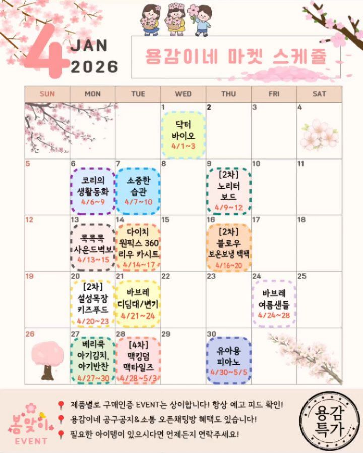 🎁 용감이네 4월 용감특가 공구 스케쥴 이벤트 🎁 1️⃣ 본 피드에 "알림" or "제품명" 댓글 남기시거나 (ex 다이치, 노리터보드 등) 2️⃣ 용감이네가 용감특가로 가지고 와줬으면 하는 제품들을 댓글로 남겨주시거나 (ex 교구, 식품, 리빙 등) 3️⃣ 응원 댓글 남겨주시는 분들께 (ex 용감이네 화이팅 응원해요 등) ⭕️ 위 3가지 중 하나만 남기셔도 이벤트 참여 완료 (팔로우+좋아요+저장 3종 세트는 기본❣️) (스토리 공유, 친구 소환하면 당첨 확률 UP🔺️) (댓글 마구마구 남겨주시고 널리널리 알려주세요📤) 💰 용감특가 제품들을 조금이나마 더 저렴하게 구매하시라고 총 5분께 5,000원 네이버페이 쇼핑 지원금을 쏩니다‼️ (@bravehome_market 팔로우 필수!) (4월 당첨자는 5월 공지 오픈과 동시에 발표하겠습니다!!) (참여하시는 분들이 생각보다 많을 경우 당첨 인원과 금액은 더더더 늘어날 수 있습니다😆 많이 참여해주세요🤩) 🎉 3월 용감이네 공구 스케쥴 이벤트 당첨자 🎉 @im_allcome @lov_biin @dori_kkk @y0ung___ @_inyoung_k 당첨 축하드립니다❤️ ⭐ 용감이네의 모든 이벤트 당첨자는 @bravehome_market @__bravehome 팔로워분들 중에서 선정됩니다! 🗓 용감이네 4월 공구 스케쥴 🗓 ✔️ 4/1~3 닥터바이오 로션, 크림, 수딩젤, 수분크림 ✔️ 4/6~9 코리의 생활동화 전 20권 ✔️ 4/7~10 소중한습관 피니셔 폼&패드, 물티슈&비데티슈 ✔️ 4/9~12 [2차] 노리터보드 자석칠판&펠트 ✔️ 4/13~15 NEW 콕콕콕 사운드벽보 7종 ✔️ 4/14~17 다이치 원픽스 360 리우 카시트+선바이저 ✔️ 4/16~20 [2차] 블로우 보온보냉 백팩 ✔️ 4/20~23 [2차] 설성목장 어린이소스3종, 국4종 ✔️ 4/21~24 [2차] 바브레 디딤대, 아기변기 2종 ✨️ 디딤대 재고 확보했습니다!! (업체측 사정으로 두번이나 밀려서 죄송해요🙏🏻) ✔️ 4/24~28 바브레 여름샌들 기획전 ✔️ 4/27~30 베리쿡 아기김치, 아기반찬 모음전 ✔️ 4/28~5/3 [4차] 맥킹덤 맥타일즈&롤러코스터&관람차 ✔️ 4/30~5/5 25건반 유아용 원목 전자피아노 ✨️ 아가드 트램폴린은 입고 문제로 5월 진행예정! ⭕️ 라인업 중간에 깜공 있을 수 있습니다! 🚨 업체 사정으로 일정이 연기되거나 취소될 수 있습니다. 🎓 좋은 아이템, 착한 가격, 미친 가성비의 믿쓰템만 교육학 석사 출신 엄마, 돈을 현명하게 가치있게 쓰는 ESTJ + ISTJ 부부의 깐깐한 눈으로 고르는 혜자 공구! 📝 하루에도 수십 개씩 오는 공구 제안 중에 고르고 골라 최대한 인친분들에게 필요한 템, 가격 혜택을 많이 드릴 수 있는 물품으로 괜찮은 업체들과 끊임없이 소통하며 준비하려고 노력 중이에요. 💰 최저가(용감특가) + 용감이네 소통방 구매자 전원 특별 혜택 + 다양한 후기 이벤트까지! 용감이네 공구는 더 저렴하고 더 혜택이 많은, 어떤 물품이라도 그냥 믿고 구매할 수 있을 정도로 성장하는 게 목표랍니다. 🙇🏻♀️🙇🏻♂️ 언제나 용감이네 믿고 구매해주셔서 감사합니다. 용감이가 먹고 사용한다는 생각으로 더 깐깐하게 검토하며 열심히 노력하는 용감이네 되겠습니다❤️ 💡 용감이네 육아 소통방에 들어오시면 매 공구 오픈 시 최저가 알림 링크를 보내드립니다! (용감이네를 지켜보신 분들은 아시겠지만 소통방 혜택 많아요😉) ✅️ 용감이네 공구 특가 오픈 알림 받으실 분들은 - - - - - - - - - - - - - - - - - - -🔻 1️⃣ @__bravehome , @bravehome_market 팔로우 2️⃣ 본 게시물 좋아요 및 저장 3️⃣ 댓글로 '알림' 적어주세요! _______________________________✔️ 👉🏻 다음 특가 공구도 놓치지 않게, ▪️ 팔로우+저장은 꼭 해두세요‼️ - 📑 5월 이벤트 추천해주세요:)