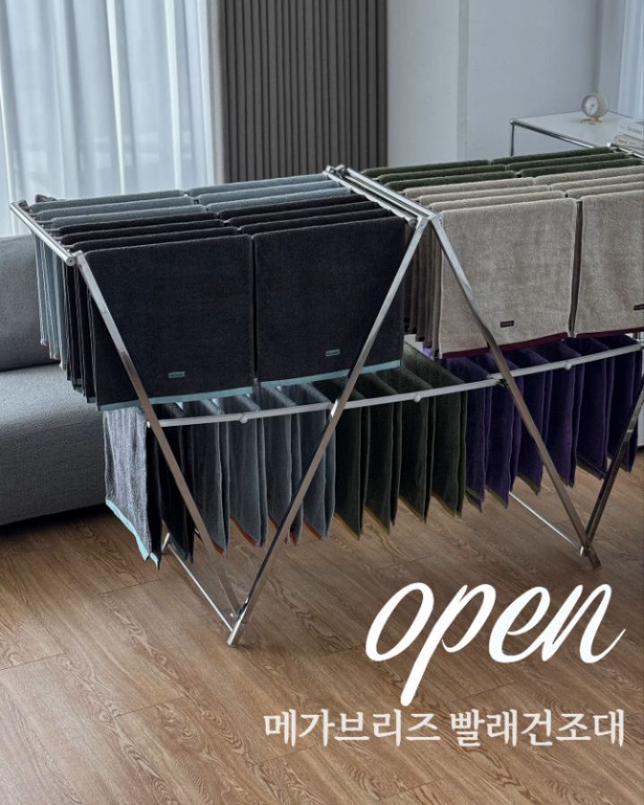 [💙메가브리즈 빨래건조대] 빨래 양 많은 날엔 건조대 자리 모자라서 문고리나 의자 위에 주렁주렁 널어두신 적 다들 있으시죠 😅 무거운 이불 널면 휘청거리고 다리 꺾이던 약한 건조대는 이제 싹 치워버리게 해줄 메가브리즈 빨래건조대 내일 지니하우스에서 보여드릴게요 🤍 일반 원형 살대가 아니라 무려 2배 이상 튼튼한 사각 고탄성 스테인리스라 30kg 하중도 거뜬하게 버티는 괴물 같은 내구성을 자랑해요 트리오 사이즈 기준으로 수건 40장까지 널 수 있는 엄청난 대용량인데 양옆으로 늘릴 수 있는 확장형이라 좁은 공간에서도 진짜 알차게 쓸 수 있답니다 번거로운 조립 1도 없이 배송받자마자 쫙 펼치면 끝나는 기특한 살림템 내일 꼭 구경 오세요 😍 📌빠른 구매 원하시면 흔적 남겨주세요 좋아요로 알림 드릴게요➰ 💟공구일시 : 4/27 - 재고 소진시 마감(한정재고)