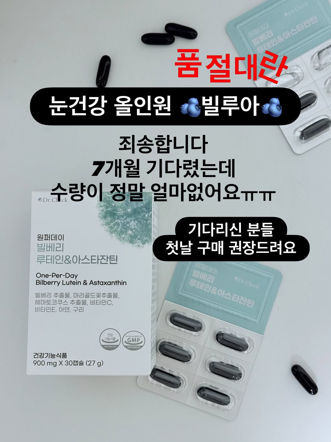#공구예고 #오픈D-2 빌베리+루테인+아스타잔틴 올인원 눈건강제품! 물량이 별로 없어서 5분전에 알림드릴게요 여러분.. 진짜 오래 기다리셨죠? 저도 목 빠지는 줄 알았어요😭 일정 계속 취소, 취소, 미뤄지다가 무려 7개월 만에 드디어 돌아왔습니다! 이거 원료 수급이 워낙 까다로웠거든요... 그렇다고 원료 타협하긴 싫었어요 게다가 이번 물량 진짜 영혼까지 끌어모았는데도 많지가 않아요. 심지어 유튜브에서 성분 배합 끝판왕이라고 입소문까지 타버려서 저번보다 소진 빠를거 같은 예감.. (떨려요 저 지금💦) ⚠️ 중요 포인트! 이번이 가격 인상 전 마지막 물량이에요. 원재료값이 너무 올라서 다음 차수부턴 가격 인상이 확정됐거든요. 그러니 무조건 이번에 쟁여두시는 게 이득입니다! 🫐 왜 ‘빌루아’여야 할까요? 시중에 루테인만 들어간 거? 많죠 근데 우리 스마트폰, 컴퓨터 끼고 살잖아요. 눈 피로까지 잡으려면 루테인 하나론 부족해요! ✅ 주원료만 무려 3가지! (부원료 X) 루테인: 전 세계가 인정하는 FloraGLO 브랜드 아스타잔틴: 품질 관리 끝판왕 AstaPure 브랜드 빌베리: 제가 직접 공장까지 확인하고 온 Indena 브랜드 여기에 비타민C, E, 아연, 구리까지! AREDS2 포뮬러 기반으로 총 7가지 기능성을 하루 딱 1알에 다 담았어요 그러니…소문 안나냐고요ㅠㅠ 제대로 골라온 제품이 갑자기 빛을 발해서 기쁘면서도… 필요한 분들 못사실까봐 걱정이😰 🫐 이런 분들 꼭 챙기세요! 눈 뜨자마자 스마트폰 보시는 분 (저요..🙋♀️) 하루 종일 모니터랑 싸우는 직장인 책이랑 씨름하는 수험생 눈이 침침하고 자주 피로하신 분 라식, 라섹 후 관리 필수인 분 📅 4/20(월) 오전10시 OPEN!이구요 🫐가격구성 3박스(3개월): 120,000원 ➡️ 81,000원 (33% OFF) 6박스(6개월): 240,000원 ➡️ 149,400원 (38% OFF) 12박스(1년): 480,000원 ➡️ 273,600원 (43% OFF) 다음 재입고는 언제가 될지 저도 장담 못합니다😭 댓글 남겨주시면 오픈 30분전에 자동 디엠으로 링크 보내드릴게요! 👇
