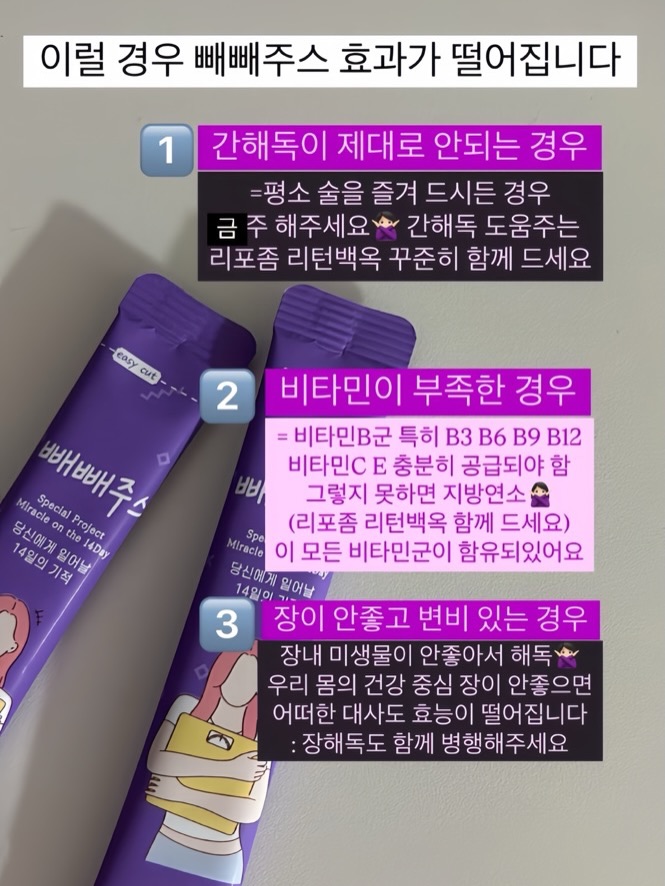 🙋🏻♀️보라 빼빼주스 효과 보기 위해서는 ? ………………………………………………………………… [4가지 천연원료 건강한 성분] ⠀ 💜아스파라거스 : 지용성독소 배출 (항산화효과) 💜레드토마토 : 리코펜 성분이 지방세포 억제 💜블루베리 : 안토시아닌 활성산소 염증물질 제거 💜아삭이고추 : 베타카로틴 지용성독소 수용성바꿈 ⠀ ➕ ⠀ 💜올리브오일 : 소화촉진 💜MCT코코넛 : 중쇄지방 지방연소상태 만듬 ………………………………………………………………… 음식으로 부터 생기난 지용성독소가 해독이 되어서 지방 세포 밖으로 나올수 있어야 합니다 이 역할을 빼빼주스 가 도와주지요 ! 첫날 3끼 모두 해독 빼빼어트가 상당히 중요 합니다 (저혈당 당뇨 있으신 분들 무리한 해독데이 추천✖️) 💁🏻♀️ 이런 분들은 빼빼주스 효과가 떨어져요 1️⃣ 간해독이 제대로 안되는 경우 : 평소 술을 즐겨 드시든 경우 빼빼어트 기간엔 금주! 간해독에 도움주는 리턴백옥 꾸준히 함께 드시기 2️⃣ 비타민이 부족한 경우 : 비타민 B군 C E 충분히 공급되야 지방연소를 도움 리턴백옥이에 다 함유 되어 빼옥이로 드시면 좋아요 3️⃣ 장이 안좋고 변비가 있는 경우 : 장내 미생물이 안좋으면 해독이 잘 안됩니다 이런 경우는 어떠한 보조제 다이어트 영양제도 효능이 떨어집니다. 장해독도 함께 병행해주세요 ☑️ 빼빼주스 5+1 10+4+잠옷 공구중