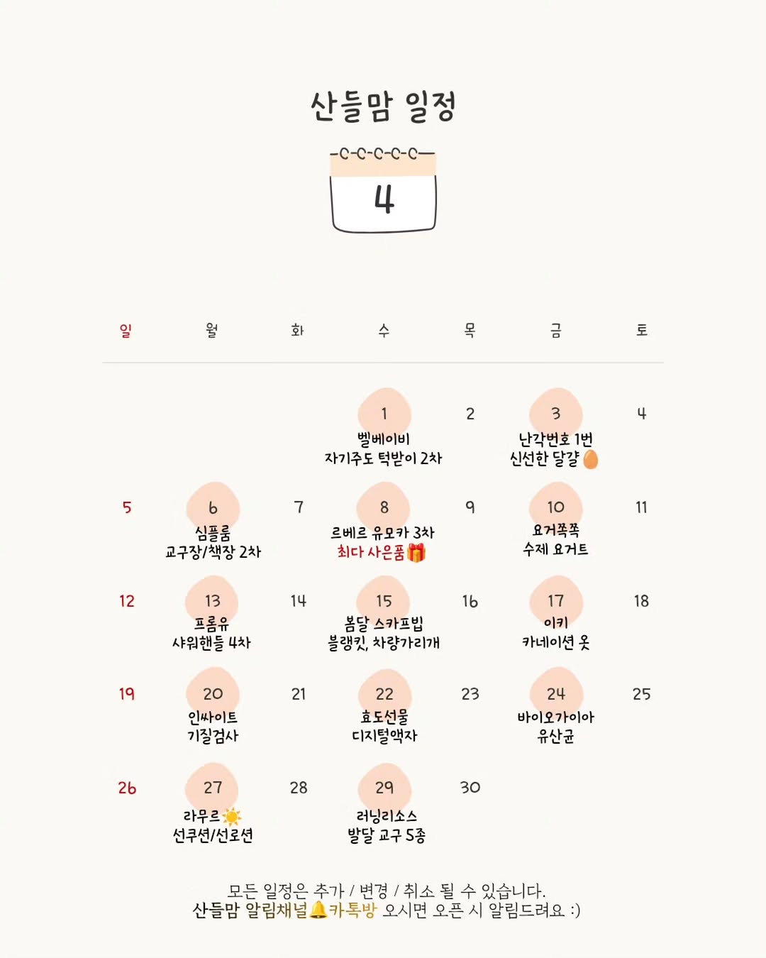 🔔 댓글에 [ 카톡 ] 남기시면 최저가 알림 단톡방 초대링크 DM 발송 :) 4월 일정 가져왔습니댜🥰 나들이 가고싶어지는 봄🌸날씨네용! 산들맘 믿고 구매해주시는 우리 육아동지분들을 위해❤️ 4월에도 일상 꿀템, 육아 필수템✨️ 최저가로 알차게 선별해왔어요 ! ✔️기다리는 제품 / 기대되는 제품 댓글 마음껏~ 남겨주세요! (중복참여 확률 UP!) 추첨하여 N포인트 3천원 쏴드려요 ✔️리그램/스토리 공유 후 "공유완" 남겨주시면 추첨하여 N포인트 3천원 쏴드려요 ─────────────── ▪️4/1(수) 벨베이비 자기주도 턱받이 2차 15개월에 자기주도식 성공🥄 ▪️4/3(금) 난각번호 1번 달걀🥚 아이도 어른도 없으면 안되는 완전식품 계란! 산란 1~3일 이내 신선한 유정란🐔 ▪️4/6(월) 심플룸 교구장/책장 2차 ▪️4/8(수) 르베르 유모카 3차 신상 2종 포함! 최다 사은품🎁 ▪️4/10(금) 요거쪽쪽 아기 요거트 어른이 먹는 것도 있어욤🥹 ▪️4/13(월) 프롬유 샤워핸들 4차 산들맘 단독 진행했던 우주 최저가🚀 ▪️4/15(수) 봄달 블랭킷, 스카프빕, 차량가리개 신상 추가🔥 최애 봄달 ▪️4/17(금) 어버이날 특별한 카네이션 옷 ▪️4/20(월) 갓성비 기질검사 / 해석 상담 우리아이 기질 파악하고 쉬운 육아 가능✨️ ▪️4/22(수) 어버이날 효도선물 디지털 액자 ▪️4/25(금) 바이오가이아 유산균 3차 6개월 지나도 먹어야합니다‼️ ▪️4/27(월) 라무르 썬 라인☀️ 선쿠션 / 선로션 / 클렌징워터 / 수딩젤 (+전 라인) ▪️4/29(수) 러닝리소스 발달 교구 5종 어린이날 선물 추천!!🎁 ─────────────── ✨️3월 일정 기대평 N포인트 3천원 당첨자🎉 @yu.__.kyungs @rro__ong @jjj27172020 @dyangyi_ @ruimeee__dyd @h.due_ @2dinggyong @seo.a_ato @dille.2 @mj_1218 자동 추첨했습니당✨️ 강산들 @ksd_mom 프로필링크에서 [이벤트 당첨 폼 작성] 해주세요 :) * 작성기한 4/2(목)까지 기한이 지날 경우, 당첨이 취소됩니당!