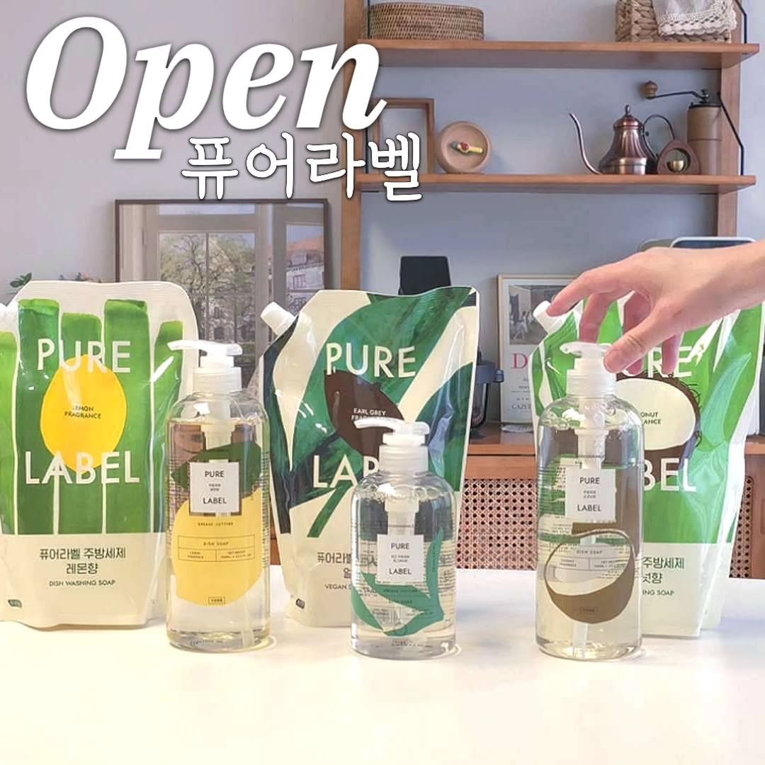 퓨어라벨 주방세제는 식물성 계면활성제를 사용하여 잔류세제 걱정을 줄이고, 생분해도 98%로 환경을 생각한 제품입니다. 보습 성분이 포함되어 있어 손이 건조해지지 않으며, 다양한 향으로 선택할 수 있습니다.