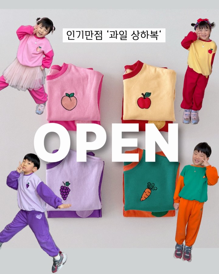 𝙊𝙋𝙀𝙉 등원룩 끝판왕 🍎과일 상하복🍇 요즘 매일 입히는 그 옷, 디엠으로 제일 많이 물어보신 그거 👀 드디어 가져왔어요… 상하세트 공구가 22,900원‼️ (쏘리질러〰️👏👏👏👏👏) ✅ 댓글에 ‘과일’ 남겨주시면 핫딜링크 바로 보내드려요 ! ⸻ 요즘 등원룩 많이 보이지만 그냥 밍밍한 맨투맨에 바지.. 다 똑같죠🥹 근데 이거‼️ 색감 미쳤죠…‼️ 쨍한 색감에 컬러조합 장난아닌데 과일 + 하트 조합이라 ❤️💛💜💚 엄마들도 좋아하지만 아이들이 더 좋아해요ㅋㅋㅋㅋ ෆ.̮ෆ ✔ 상하세트로 코디 고민 끝 ✔ 따로 입어도 활용도 최고 ✔ 하나로 2~3코디 가능 지금부터 입히기 딱 좋은 두께 날 더 좋아지면 → 이거 하나로 끝👌 더워지면 → 반팔티 + 바지로 또 가능 이 옷 하나로 포인트줘서 너무 이뻐요 💖 ⸻ 등원룩으로도 최고고 여행 갈 때 입히면 색감 쨍해서 사진도 진짜 잘 나와요📸✨ 그래서 한 번 입히면… 자꾸 손 가서 이것만 입히게 됨ㅋㅋㅋㅋ 📍사이즈 : 5호~13호 (요즘 13호 상하복 찾기 힘든거 아시죠? 금액추가❌) 📍색상 : 🍑 복숭아 / 🍎 사과 / 🍇 포도 / 🥕 당근 색감 하나하나 다 너무 이쁘고 귀여운디 이번 컬러 조합 특히 잘 나와서 원픽 색상 고르기 힘드실걸요…🥹💗 ⸻ ✅ 공구기간 : 4월 1일 ~ 4월 5일 🚚 주문 후 2주 정도 소요 ◡̈ ⚠️ 세탁은 냉수세탁으로 해주세요 ! #등원룩 #등원룩코디 #상하복 #상하복맛집 #상하복세트