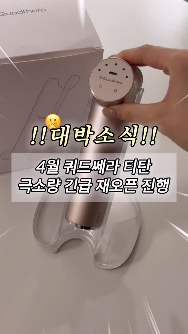 [4월]쿼드쎄라 티탄👑 긴급 재오픈🔥 구매자분들이 감탄하는 혜택 + 구성까지 📍최저가 공구는 프로필 링크에서 바로 확인하세요 🎁 이벤트 안내 (이벤트 참여는 해당 릴스 ❌ 고정된 릴스에 댓글 남겨주셔야 참여됩니다) 1. 팔로워 전체 이벤트 ➡️ ‘티탄’ 댓글 남기면 자동 참여 완료! 디엠으로 최저가 구매 링크 + 혜택 안내드려요 ♥ 일단 무조건 댓글 남기고보세요!! 무조건 득...완전 득!! ⭐️증정 : 쇼핑 지원금 3만원(2명) 2. 구매자 전체 증정 이벤트 ⭐️거치대 + 페이백 + 전용 겔 80g 3개 + 포헤르츠(30매 마스크팩 + 스킨 시그널솔루션) 등등 [이벤트가 너무 좋아 글로 작성 불가,, 댓글 남기시고 이벤트도 자동 참여 + 혜택도 꼭 받아보세요.. 놀라실거예요? 3. 구매자 추첨 이벤트 ➡️ 구매 완료 후 [구매완료 + 핸드폰 뒷자리] 남겨주세요! ⭐️쿼드쎄라 전액 페이백(1명) ⭐️쿼드쎄라 미니튠 증정(1명) ⭐️늘씬수 15포 증정(15명) ➡️구매자 분들은 1+3번 모두 참여 가능합니다♥ (2번은 구매자 전원 증정) 본사 요청이 많았던 쿼드쎄라 일정, 아직 오픈 예정이 남아 있었지만 다가오는 ✨5월 가정의 달 선물✨ 문의가 많아 일정에도 없던 극소량 긴급 오픈하게 되었어요🥹 요즘 LDM 디바이스 많아서 고민되시죠? ✔️ 쿼드쎄라 티탄 포인트 💡 피부 접촉부 티타늄 → 흡수력 상승 (실제 피부과 기기도 티타늄 사용) 💡 1·3·10·19MHz 특허 기술 → 1 → 19 → 3 → 10 최적 순서 설계 👉 즉, “비슷한”이 아니라 피부과와 동일한 원리로 만든 디바이스 ▪️피부 유수분 밸런스 ▪️유효 성분 흡수 ▪️피부 장벽 / 회복 / 진정 ▪️피부 탄성 / 탄력 치밀도 케어 ▪️피부 톤 / 광채 개선 이 모든 걸 한 번에 케어하는 게 바로 쿼드쎄라 티탄입니다👑 🔥루피너스는 쿼드쎄라 티탄 공구 특가는 물론이며 그 어디에도 없는 혜택아나 자신 있게 말씀드립니다! 🔥혜택+구성 놓치지 마시고 알차게 입문해 보세요💕