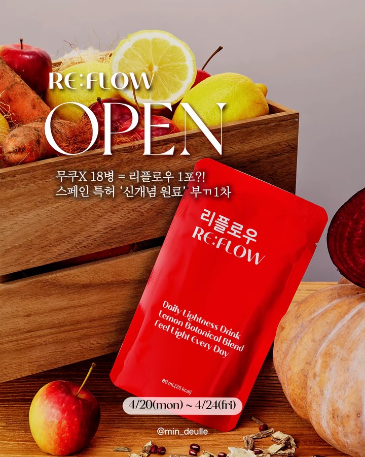 리플로우는 ABC주스 베이스와 식물성 10가지 원료로 몸의 흐름을 개선하는 음료입니다. 첫 런칭 이벤트로 선착순 30명에게 본품 1박스를 추가로 제공합니다.
