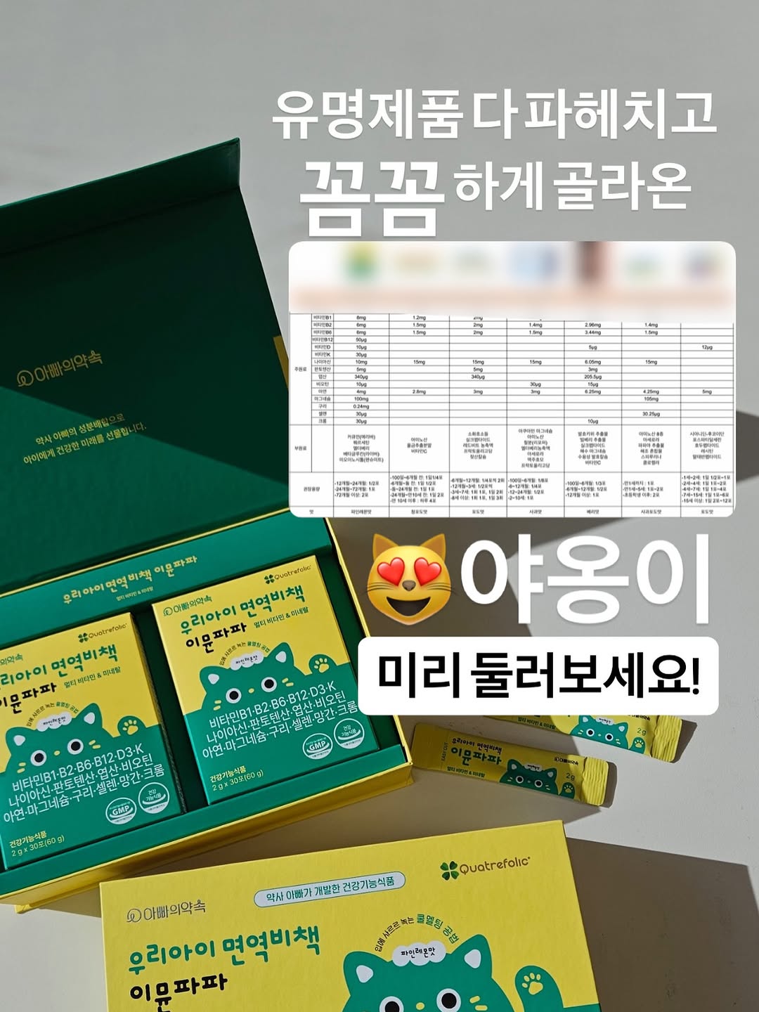 #상담 #오픈예고 오늘밤12시 오픈! 우리 아이 지금 먹는 영양제랑 같이 먹어도 되는지? 궁금하신 분들 댓글에 ✔️아이연령, 개월수 ✔️먹고있는 제품이름 남겨주세요! 체크하고 🐱용량조절 🐱섭취시간 상담 도와드릴게요:-) 압도적 스펙의 야옹이 🔻이런친구들 고려해보세요🔻 🐱입맛 없고 기운 없는 아이 🐱편식하는 아이 🐱전반적인 영양 밸런스가 필요한 아이 🐱환절기 면역 케어가 필요한 아이 🐱예민해서 밤마다 잠 설치는 아이 🐱뼈 성장이 고민인 아이 🐱여러 제품 먹기 힘들어하는 아이 🚀 야옹이영양제만의 압도적인 스펙 ✔️12가지 비타민 & 9가지 미네랄 올인원 비타민 A, B군, D3, K부터 마그네슘, 구리, 아연, 망간, 셀레늄까지 한 번에 해결하세요 ✔️검증된 프리미엄 원료사 세계적인 DSM사 비타민 원료와 특허받은 활성형 엽산(Quatrefolic)을 사용했구요! ✔️흡수율 극대화 미국 Nutrisol사 무기셀레늄과 4중 복합 마그네슘(100mg) 배합으로 흡수율을 높였습니다 마그네슘 이정도 들어있는 키즈제품 없을거에요 ✔️시너지나는 부스터들 메리바 커큐민(50mg) 천연항히스타민제라 불리는 퀘르세틴(100mg) 특허원료 엘더베리(100mg) 독일 라이버사 베타글루칸(220mg)등 퀄리티 높은 부원료를 꽉 채웠습니다. 부원료지만, 주원료만큼 팍팍 넣은 제품이에요 ✔️파인레몬맛의 입에 사르르 녹는 가루 타입 그대로 섭취하거나 우유/요거트에 타서 줄 수 있습니다:-) 🗓️ 공구 기간: 4/22(수) 00:00 오픈 - 4/28(화) 23:59 🎁구매이벤트 체크해보세요 1. 사비로 준비했어요! 총 20분께 미니 1박스(30포)를 랜덤으로 보내드릴게요 구매이벤트는 다시 올려드리겠습니다:-) 2. 2박스이상 구매 선착순 100분께 어린이 과학동아 2개월 구독권 5월15일부터 순차적으로 발송됩니다! 초등맘이라면 이거 너무 좋아할거에요 3. 2박스이상 구매 모든분들 줌라이브 특강 링크 보내드려요 내 아이에게만큼은 최고만 주고 싶은 엄마의 마음은 다 똑같잖아요? 그래서 직접 저희아이들에게 테스트해보자마자 바로 준비했답니다! 이번 기회에 꼭 정착해 보세요! 상담양식 ✔️아이연령, 개월수 ✔️먹고있는 제품이름 남겨놔주시면 순차적으로 하나씩 답변 해드릴게요:-) 편-하게 남겨놔주세용!!