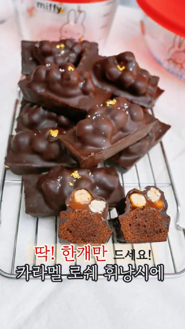 🐰미피 믹싱볼 & 계량컵 공구중! 🎁 구매 댓글 이벤트(추첨) 1. 켄우드 핸드믹서 6만원가 3명 2. 네이버페이 5천원권 3명 . . . 📅기간: 3/25일 00시부터~ 3/29일 자정까지 (한정수량이라 소진시 마감합니다) . . . 🚨4월부터 가격인상 공지 받았어요. 📌가격인상전 마지막 공구예요! ✅쿠팡보다 싼 2만원대 가격!! 🚚최저가 할인에 무료배송까지! ———————————— 저는 달지만 달지 않은 디저트를 좋아해서 대체로 제 레시피는 그나마 설탕양을 줄인 레시피예요 ㅎㅎ 그런데 요즘따라 자꾸 카라멜과 초콜릿, 통헤이즐넛의 조합이 먹고 싶더라고요.(헤이즐넛 분태X) 카라멜이 들어가서 달지만 딱 1개만 먹으면 괜찮겠쥬??? 사실 어제 만들다 망했다죠;;; 그래서 다시 보완한 레시피!! 지금 공유할께요 ^^ 🍩카라멜 로쉐 휘낭시에 레시피 🥞휘낭시에 반죽 (12개) 버터 135g 흰자 135g 설탕 70g 소금 1g 박력분 54g 아몬드파우더 68g 코코아파우더 12g 바닐라 익스트랙 3g 🍯카라멜 소스 설탕 57g 생크림 34g 물 7g 소금1g 물엿 10g 버터 10g 통헤이즐넛 90g 🍫코팅용 초콜릿 카카오 70%다크 커버춰 초콜릿 180g 포도씨유 36g 👩🍳만드는 법 1. 버터는 헤이즐넛 버터로 태운 뒤 내열용기에 옮겨 식혀주세요.(40~60도) 2. 달걀 흰자에 설탕을 섞고 가루류를 채쳐 섞어요. 3. 헤이즐넛 버터를 넣은 뒤 유화시키고, 뚜껑 덮어 냉장휴지 1시간 4. 통헤이즐넛은 볶고 설탕을 녹여요. (오븐에 구워도 되요. 120도 15분) 5. 전자렌지에서 생크림을 15초간 데운 뒤, 설탕이 갈색으로 타면 불을 끄고 생크림을 부어 카라멜을 만들어요. 6. 내열용기에 옮겨 식히고 볶은 헤이즐넛을 넣어 섞은 뒤 냉장고에서 굳혀요. (3시간이상) 7. 휴지한 반죽을 틀에 짜주고 반죽을 사이드로 붙여 가운데가 부풀지 않도록 구워요. (190도 15분) 8. 굽자마자 식힘망에서 완전히 식힌 뒤, 굳힌 카라멜을 꺼내요. 9. 한 스푼씩 분할해 휘낭시에 위에 올려 냉동보관해요.(장갑끼고 식용유를 손에 살짝 바른 뒤, 손으로 모양을 잡아 휘낭시에 위에 올려주세요) 10. 다크 초콜릿을 녹이고 포도씨유를 넣어 꼼꼼하게 섞어서 코팅 초콜릿을 만들어요. 11. 차가운 휘낭시에를 이쑤시개로 찍어서 초콜릿에 담가 코팅한 뒤 소금을 뿌려요.(초콜릿을 묻힌 뒤, 한번씩 털어내줘야 너무 두껍지 않게 코팅되요) #휘낭시에 #초코휘낭시에 #홈베이킹