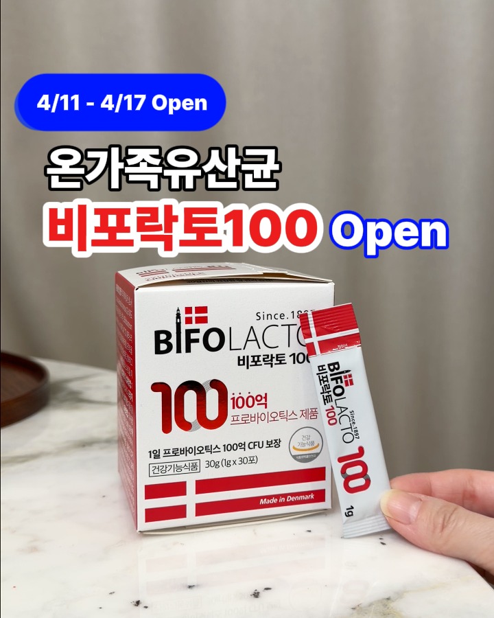 📌 < 비포락토100 > 혀에 닿으면 사르르 녹는 온가족 눈꽃유산균❄️ 최저가 공동구매 오픈합니다 ▪️공동구매 오픈 : 4월 11일 - 4월 17일▪️ ▪️제품명 : 비포락토 100억 프로바이오틱스 ▪️ 🔻최대 63%할인율 온가족 유산균! 🎁랜덤추첨이벤트! : 구매하신 분 업체에서 랜덤추첨 1통씩 더 선물드리는 이벤트 총10분께 나갑니다! ✅최대 63% 할인율 ▪️공구주기 3개월 ▪️소비기한 2027-09-23 📌할인혜택안내 (1박스=30포) 1️⃣4박스 192,000원➡️78,900원 (한달분 19,725원) 59% 할인율 2️⃣8BOX구성 384,000➡️146,500원 (한달분 18,313원) 62% 할인율 3️⃣12박스 576,000원➡️215,800원 (한달분 17,983원) 63% 할인율 ⠀ < 비포락토100 > 눈꽃유산균 특징 ➡️ 1포에 100억 유산균 보장 ➡️ 프리미엄 균주단 2종류만을 함유 ✅ LGG균주 ✅ BIFOLAC12균주 ➡️ 이지멜트(EASY-MELT) 유산균! ➡️ 맛과 균주 구성이 대단히 좋아 온가족이 함께할 수 있어요🫐 ➡️ 덴마크 현지 연구개발, 완제품 📌 비포락토100 애용하시는 분이 정말 많으시죠 유산균은 늘 말씀드리듯이 검증된 균주, 보장된 균수가 핵심인데요 비포락토100, 눈꽃유산균은요❄️ 검증된 2종의 균주만으로 100억 보장을 하면서 정말 맛있게 사르르 먹을 수 있는 덴마크 완제품 유산균입니다🇩🇰 매일아침 유산균루틴을 만드는데 정말 많은 도움이 될 수 있는 제품이에요! 검증된 균주 2종으로 100억을 보장하는 < 비포락토 100억 > 공동구매입니다 :) ♥️ 많은 도움 되시길 바랍니다 행복한 주말보내시구요. 감사합니다!