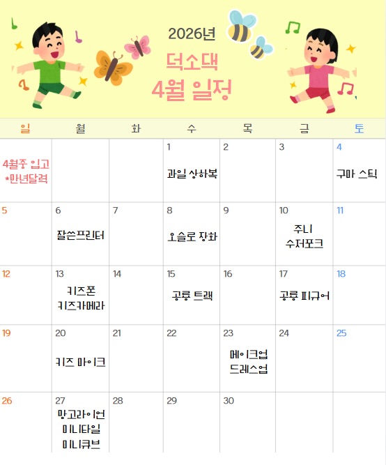아이들이 좋아하는 제품들로 구성된 4월 공구 달력입니다. 어린이날 선물로 적합한 아이템을 모았습니다.