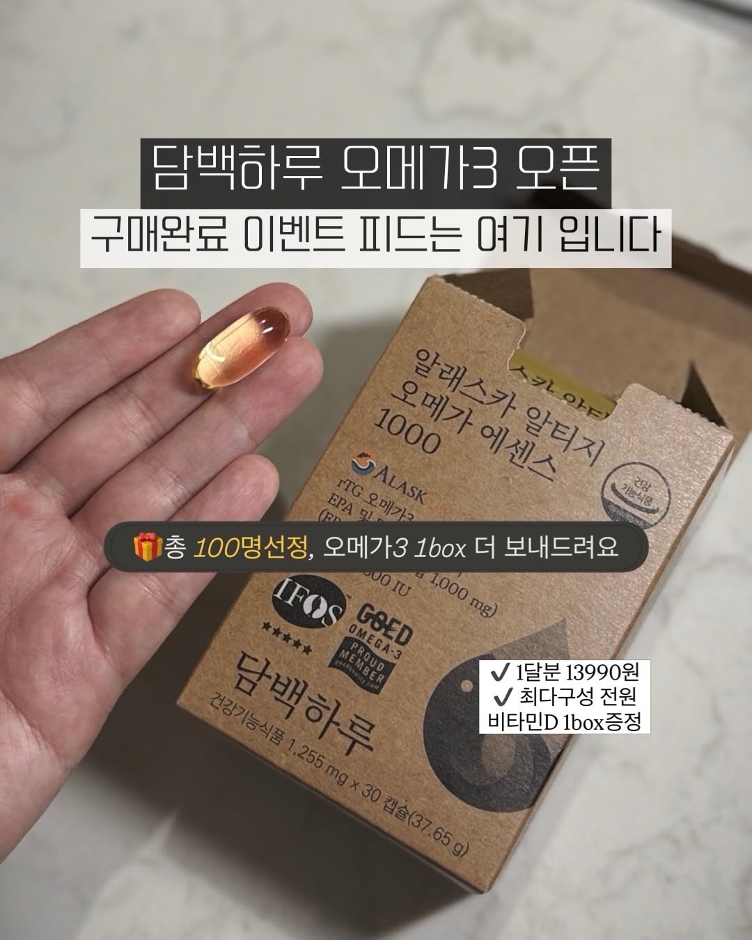 🎁오메가3 구매완료 이벤트피드는 여기 입니다. 총 100명 뽑으니 확률 높아요~ 구매후 꼭 남겨주셔요^^ ⚠️이벤트 내용! (총 100명) 구매후 구매완료 댓글만 남기면 참여 완료! 🎁랜덤으로 100명 선정해서 본품 오메가3 한 통 더 보내드려요💛 총 100명이라 당첨확률이 높습니다👍👍 공구 마감 후 스토리에 발표합니다! ✔️ 1달분 13990원 ✔️ 최다구성 전원 비타민D 1box증정 담백하루 오메가3 잠시 후 오전 10시 오픈합니다. ✅ 공구 제품 소개 담백하루 알래스카 알티지 오메가 에센스 입니다. 이제품은 1알당 오메가3 함량 EPA+DHA = 1000mg로 만족하실만한 함량 입니다. 80% 순도의 원료를 알래스카오메가 원료로 만들었습니다. 주목할만 한 점은 100% 단일 어종 알래스카 폴락만을 사용하였다는 점인데 하나의 어종만 사용한다는 것은 관리를 아주 철저히 한다는 것이라 생각하시면 됩니다. 관리 잘 된 원료의 가성비 있는 제품원하시면 담백하루 제품 충분히 고려하실만 합니다.