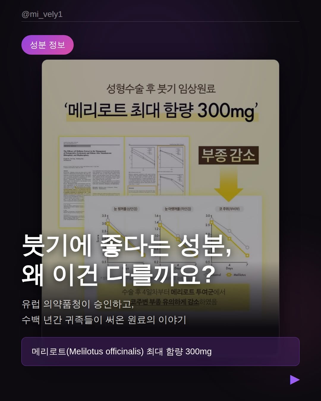 “메리로트요? 그게 뭐예요?” 👀 저도 처음엔 그랬어요. 이름도 생소하고, 발음도 어색하고. 근데 알고 보니까 완전 레전드 성분이에요 😮 쉽게 설명할게요. 우리 몸이 붓는 이유가 뭔지 아세요? 혈관 벽이 약해지면 혈관 안에 있어야 할 수분이 밖으로 새어나가요. 물이 살 속으로 스며드는 거예요. 그게 바로 붓기예요. 메리로트는 이 혈관 벽을 튼튼하게 해줘요. 수분이 새지 않게 막아주는 거죠 🔒 거기다 염증도 줄이고, 혈액순환도 도와줘요. 붓기의 원인 세 가지를 한 번에 잡는 성분이에요!!😱 이게 그냥 민간요법 얘기가 아니에요. 유럽 의약품청(EMA)이 공식으로 인정한 원료고, 중세 유럽에서 왕의 치료제로 쓰였을 만큼 수백 년 역사가 있는 성분이거든요 👑 근데 이게 단백질쉐이크 안에 들어있어요. 그것도 최대 함량 300mg으로요⭐️ 📌단백질 챙기면서 붓기까지 잡는 거, 이게 이너플로 브이시너지가 다른 이유예요. 슬라이드에 논문 출처까지 다 넣었으니까 한 장씩 넘겨봐요 🤍 . . . 🛒 4월 공구 | 4/20(월) → 4/22(수) 마감 프로필 링크에서 확인하세요 👆