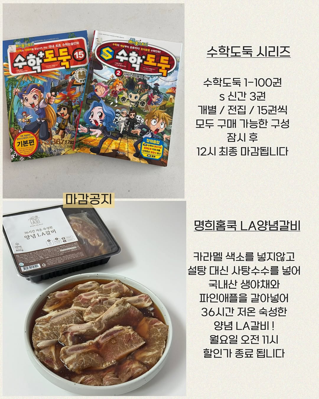 📌 마감공지 적극 추천하는 수학 도둑 시리즈와 명희홈쿡이 직접 개발한 건강하고 맛있는 양념 LA갈비 할인행사 마감공지 드립니다 👋 ⭕️ 수학도둑 시리즈 잠시 후 12시 최종마감 ⭕️ 양념 LA갈비 월요일 오전 11시 최종 마감 ✔️ 수학도둑 시리즈 - 재미와 학습을 한 번에 스토리 속에서 수학 개념이 자연스럽게 반복되고 연결돼 아이들이 ‘공부’라고 느끼지 않아요 - 교과 연계 수학 구성 초등 교과 과정 기반으로 기초 개념부터 차근차근 쌓아주는 구조예요 - 기본 → 심화 → 창의 단계 구성 개념 이해에서 끝나는 게 아니라 생각하고 응용하는 과정까지 이어져요 - 초등을 넘어 중등 개념까지 연결 읽다 보면 자연스럽게 중학교에서 배우는 개념까지 접하게 돼서 수학의 큰 흐름을 미리 경험할 수 있어요. - 집중력 & 사고력 강화 스토리 속에서 문제를 해결하며 전개되기 때문에 단순 계산이 아닌 ‘생각하는 힘’을 키워주는 데 도움이 돼요 ✔️ 명희홈쿡 양념 LA 갈비 - 적당히 뼈가 작은 원물을 사용해 고기양이 많고 10mm 두께로 썰어낸 다음 맛있는 정도의 기름을 남기고 손질 했어요 - 초이스 상위 등급의 소고기를 사용해 육질이 연하고 풍미가 좋아요 - 인위적인 첨가물을 최대한 배제해 아이부터 어른까지 모두 안심하고 맛있게 양념까지 먹을 수 있어요 ( 인공색소, 글루탐산나트륨, 농축액 무첨가 ) - 자극적인 양념이 아닌 국내산 생야채와 파인애플 아보카도 오일을 넣어 36시간 저온 숙성해 잡내를 제거하고 고기를 부드럽게 만들었어요 ___________________________ ☝️내일은 명희홈쿡 뼈없는 저염 한우 갈비탕 오픈 하는날입니다 ! 내일 오픈 피드로 찾아뵐게요 ☺️